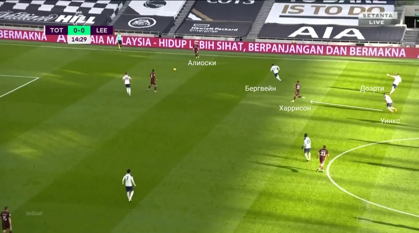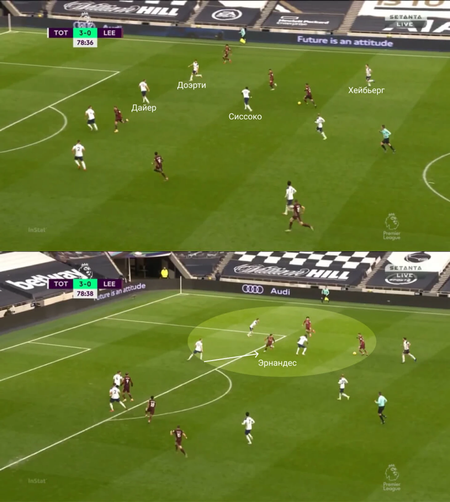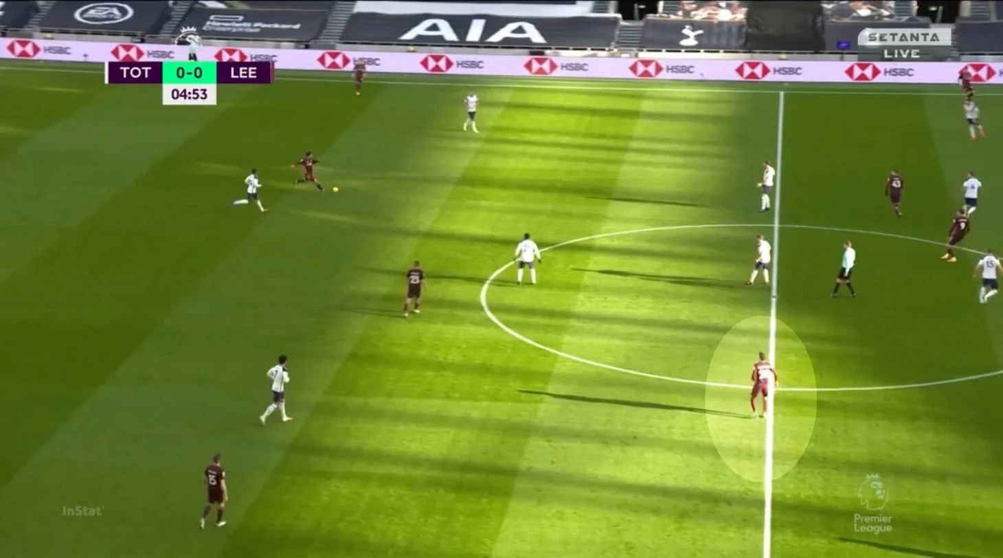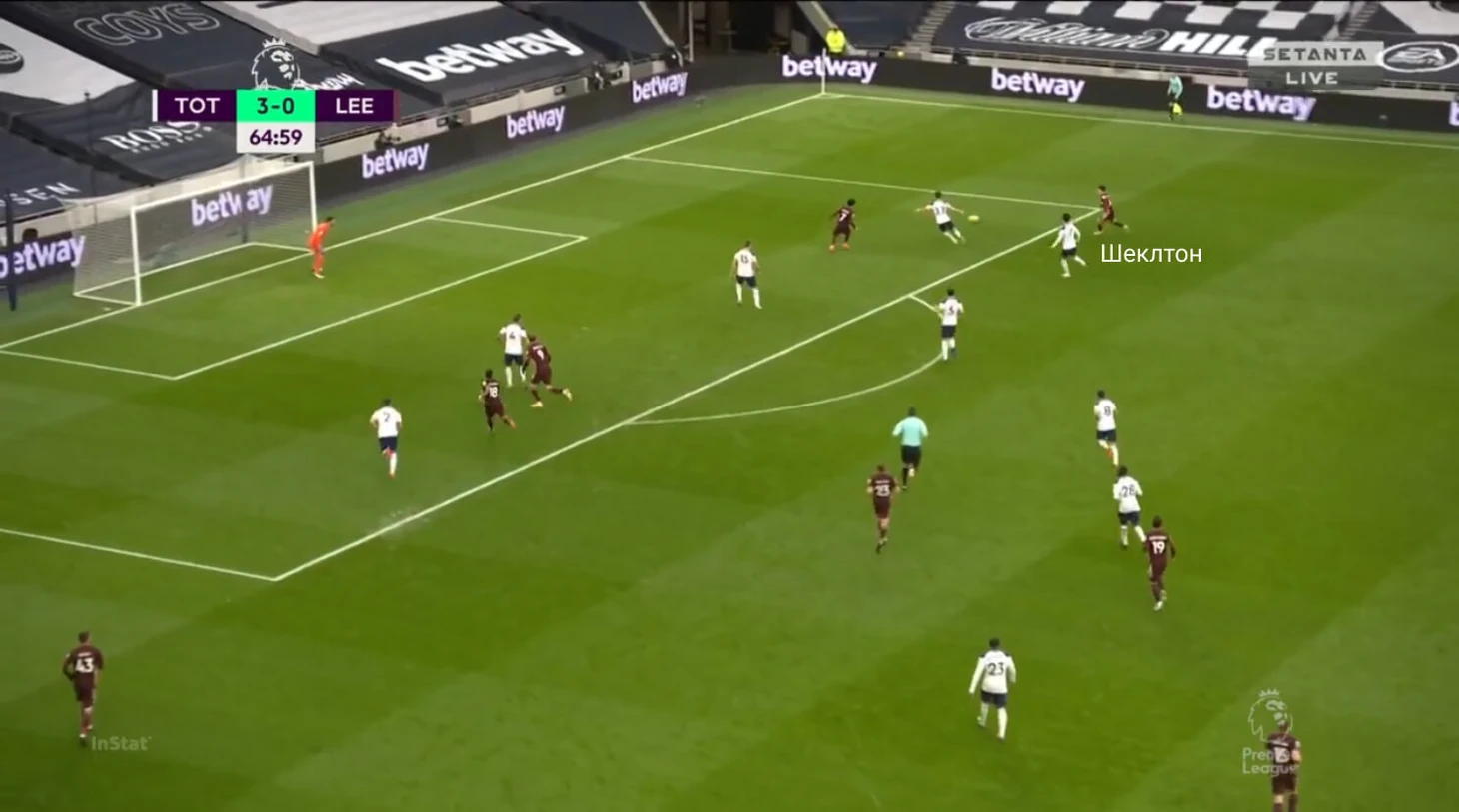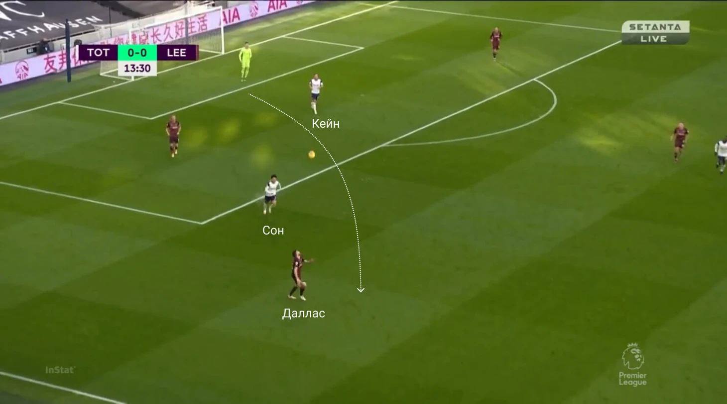 Дэвис и Сиссоко доиграли эпизод до конца, не позволив пройти через фланг. Этот пример показателен и с другой стороны: «Лидс» не подстроился под упущение «Тоттенхэма» и запорол очевидный шанс.