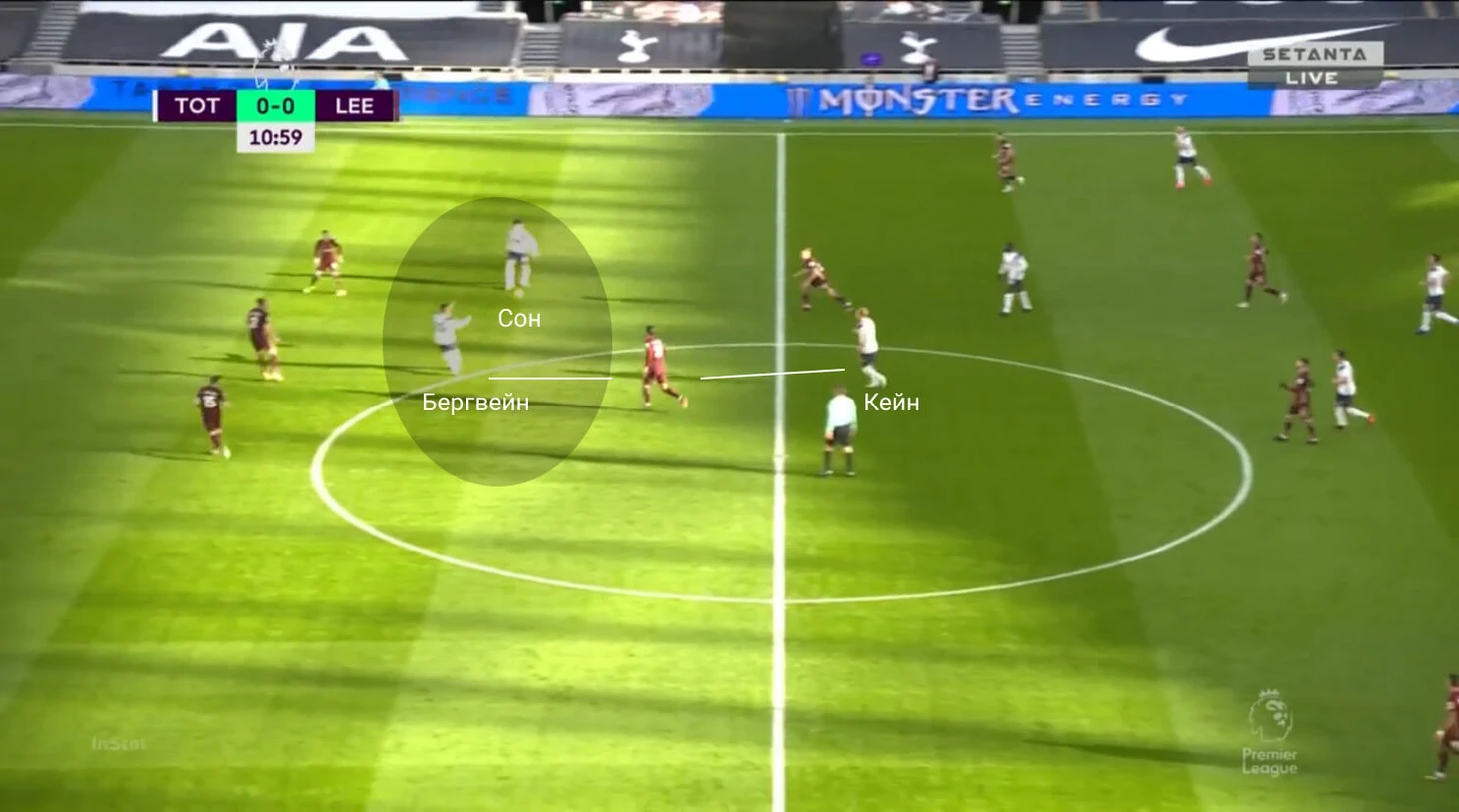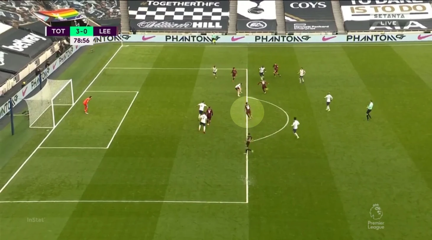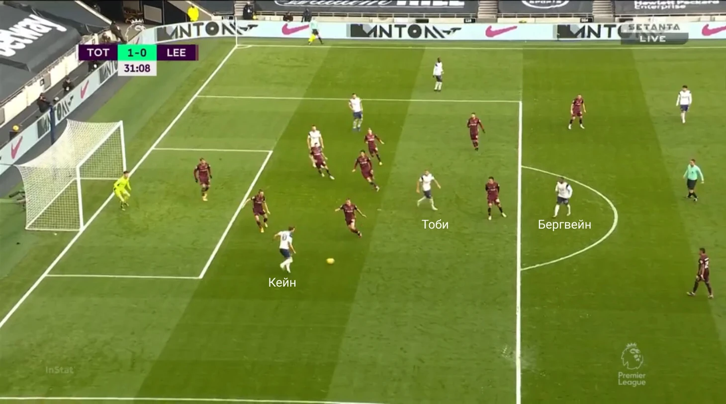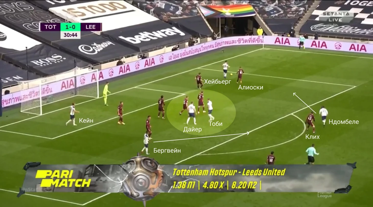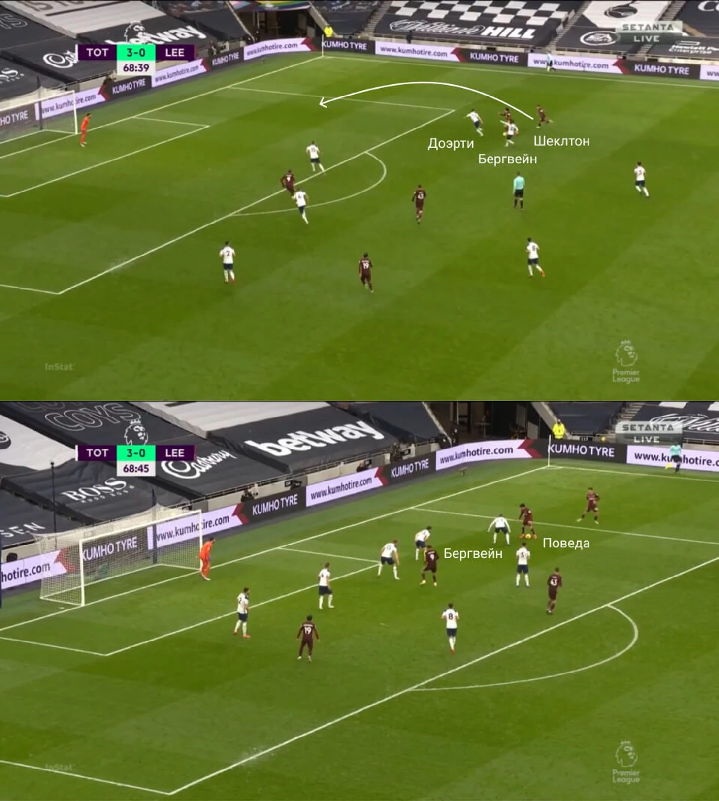 Дэвис и Сиссоко доиграли эпизод до конца, не позволив пройти через фланг. Этот пример показателен и с другой стороны: «Лидс» не подстроился под упущение «Тоттенхэма» и запорол очевидный шанс.