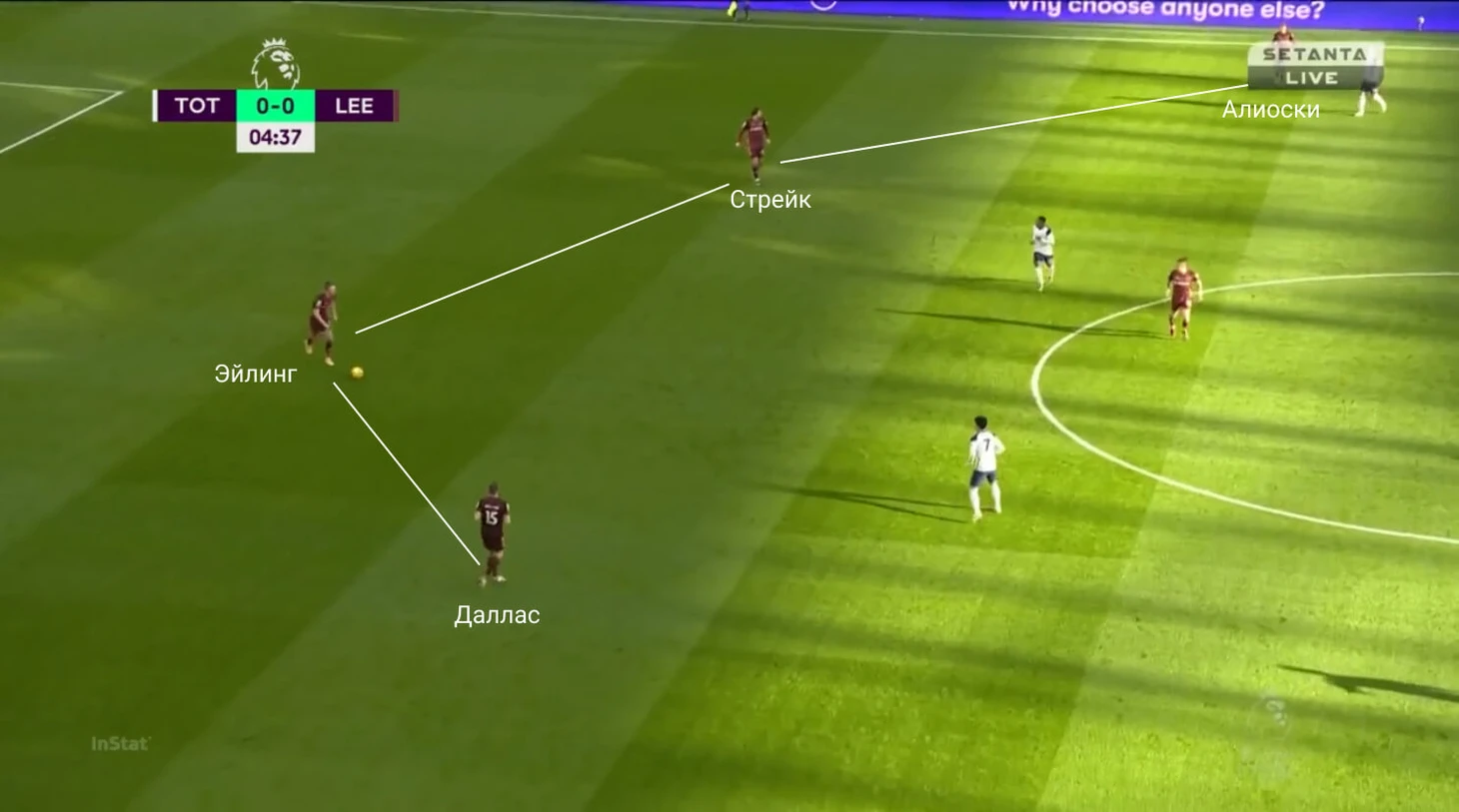 Во-вторых, эпизодически Даллас располагался чуть глубже, создавая подобие тройки центральных защитников. Было удобно: в этой фазе «Тоттенхэм» не рушил схему высокой опекой защитников, а «Лидс» контролировал мяч.