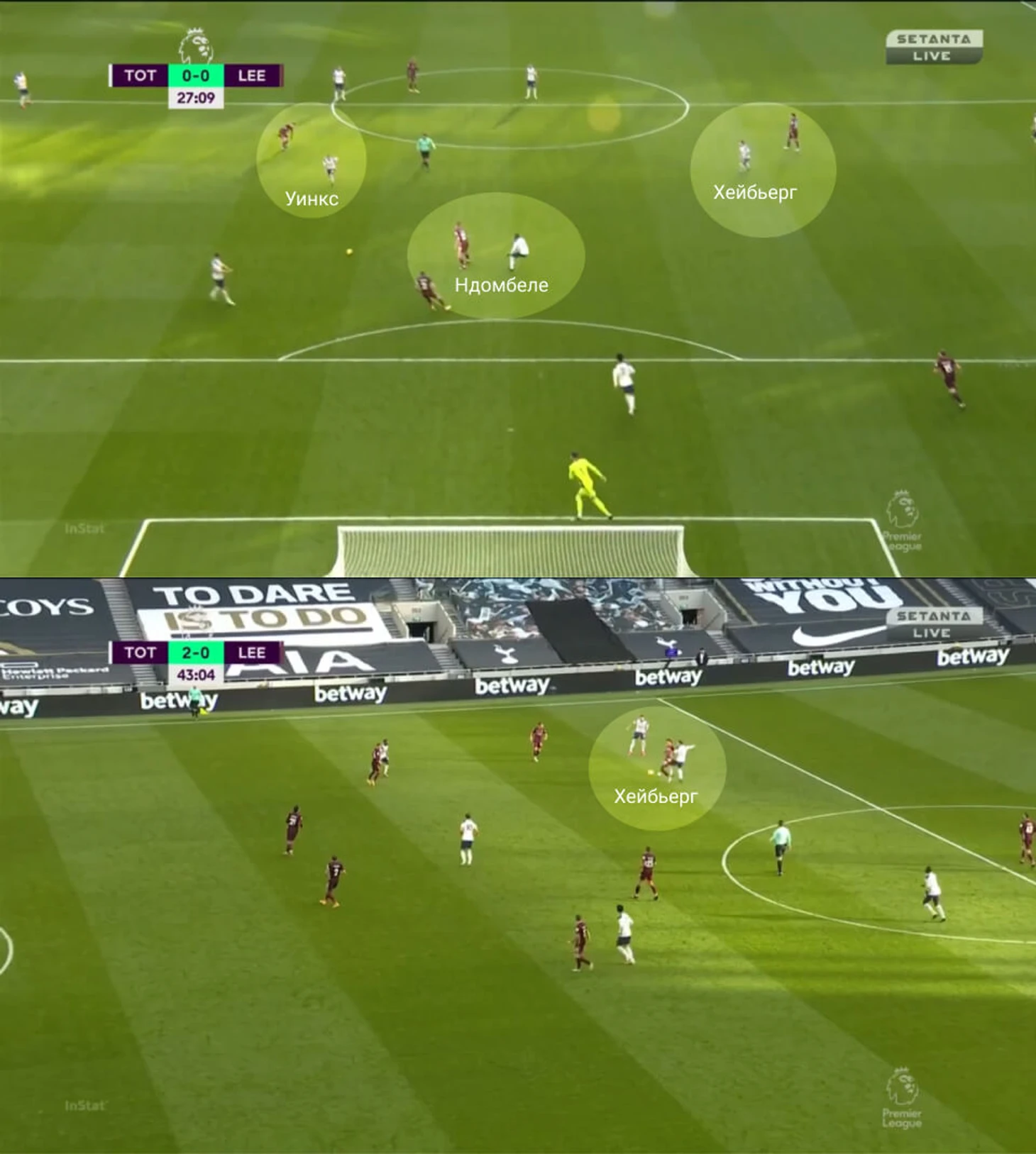 Все это провоцировало гостей на ошибки в центре поля, где «Тоттенхэм» поставил шлагбаум. Более плотная игра по центральным полузащитникам стала ключевым моментом: Уинкс и Хейбьерг контролировали Родриго и Клиха, а по Филлипсу более плотно сыграл Ндомбеле. Два перехвата превратились в два гола.