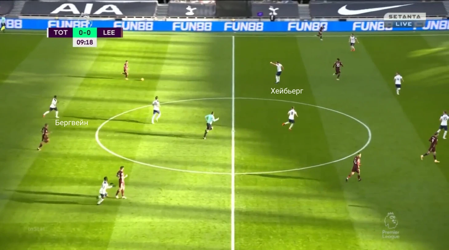 8. Поменялись роли фланговых игроков: до этого Сон и Бергвейн чаще двигались в полупространстве, теперь же было больше давления по крайним защитникам. Из-за этого «Лидс» чаще забрасывал мяч на фланги, но и здесь Доэрти и Дэвис встречали агрессивно.