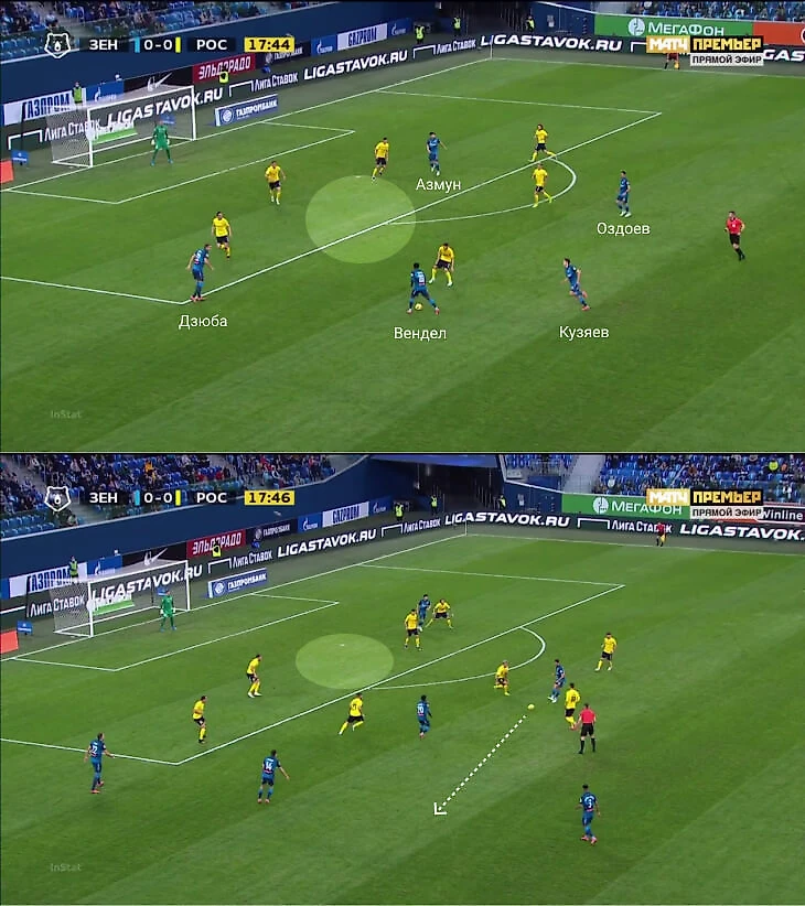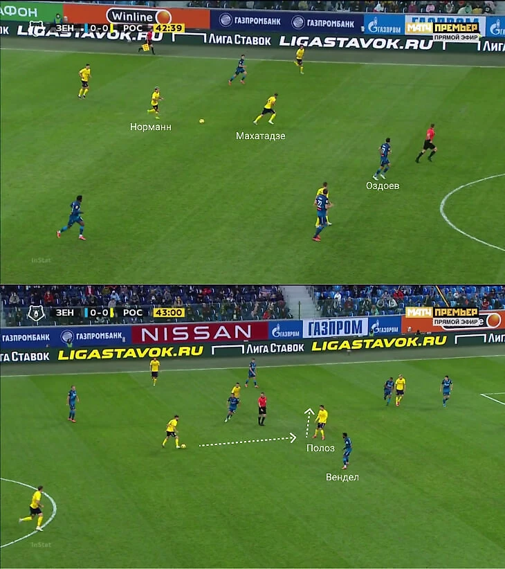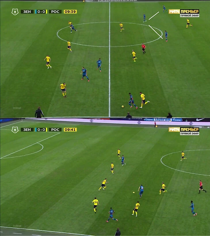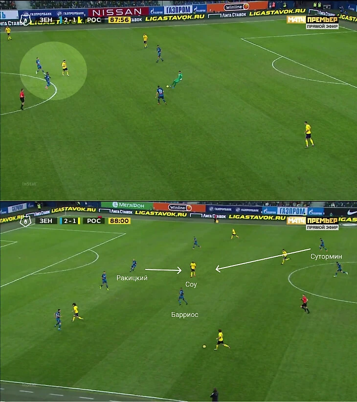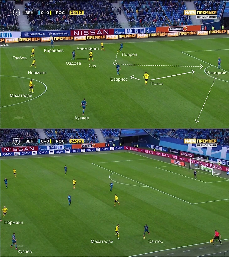Конкретный пример: Соу сместился от Барриоса к Оздоеву, Полоз в разрыве между Ракицким и Барриосом. У «Зенита» сразу несколько вариантов под розыгрыш: моментальный перевод налево или транзитом через Ракицкого/Барриоса. Хозяева выбрали самый долгий вариант: перевод налево через пас назад на Ракицкого от Барриоса.
