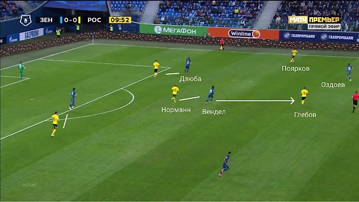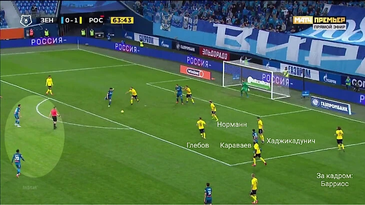 Итоги: «Зенит» оголил фланги, а у свободного Норманна несколько вариантов продвижения. Он выбирает розыгрыш, через который «Ростов» разыгрывал численное преимущество над Кузяевым (в кадре не видно, как Барриос страховал Вендела, который играл по упущенному Глебову).