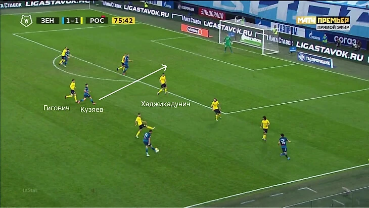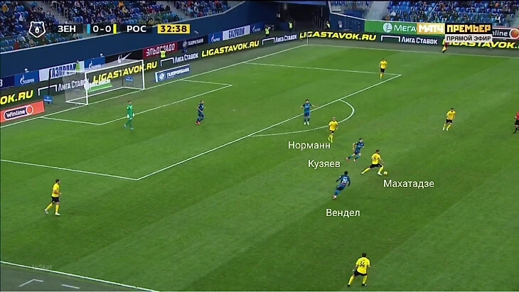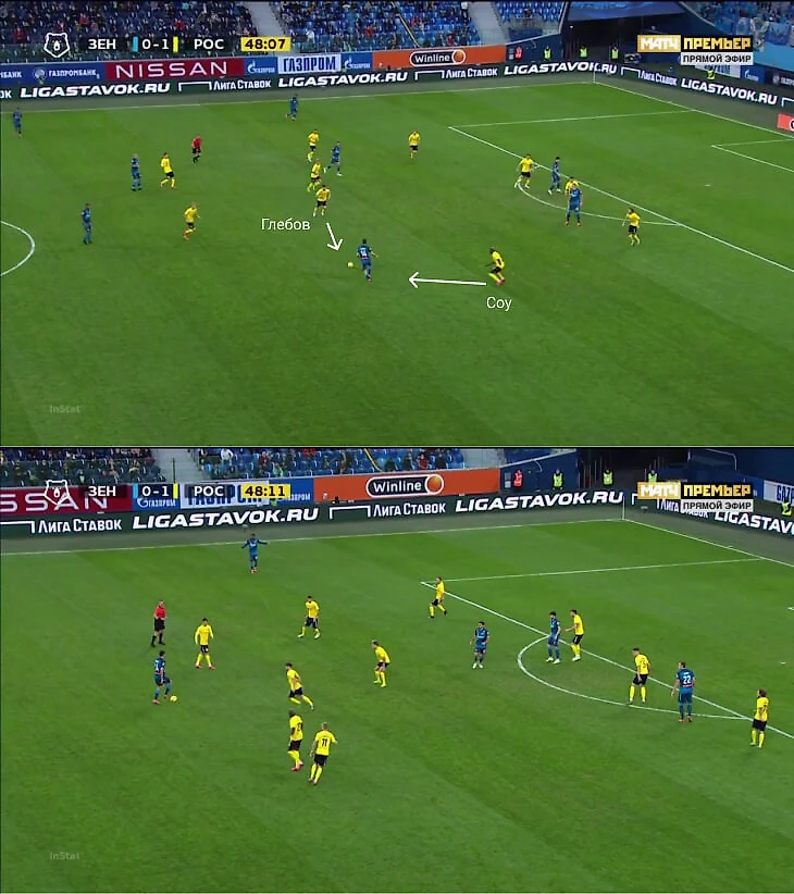 Несмотря на долгое продвижение на фланг, «Зенит» все равно оказался в неплохой ситуации: полузащитное трио «Ростова» практически разрушено (нужен только точный пас от Кузяева), подстраховать его сложно: выдернувшийся центральный защитник оставит второго 1-в-2 против Азмуна-Дзюбы, а если выдвинется Альмквист, освободит фланг для Караваева. Но в итоге Кузяев ошибся.