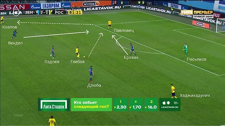 Характерный эпизод: Хаджикадунич выманил на себя Дзюбу, оставив Ерохина против Песьякова и Полтавца. Вторая причина прохождения давления – запоздалые реакции петербуржцев: Оздоев плотно сыграл по Глебову, но Вендел ориентировался не по Козлову, а по Полтавцу (куда логичнее оставить его Ерохину). Итоги: Вендел опоздал, а «Ростов» без проблем перевел мяч направо.