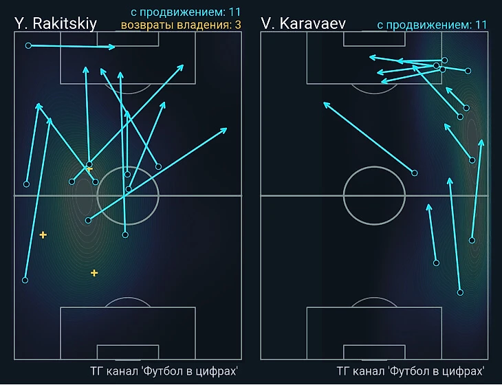 Ракицкий и Караваев – лидеры «Зенита» по передачам с продвижением (по одиннадцать). Ярослав больше двигал мяч вертикально (опасные передачи на Караваева), помогал высокой позицией во втором тайме. Вячеслав угрожал с фланга (четыре паса – под удар), качественно угрожал после аутов (помог с двумя опасными атаками).
