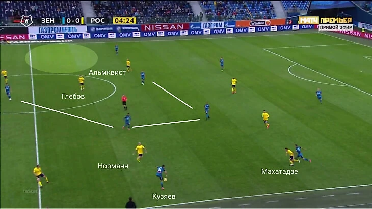 Главная установка – выгонять «Зенит» на фланги. Далее ростовчане группировались: важная часть движения – узкое расположение Полоза и Альмквиста. Во-первых, они стремились насыщать центр через их нахождение в створе штрафной. Во-вторых, если мяч был на левом фланге, в центр приходил Альмквист, если справа – Полоз. Долгой проверки на дистанции не вышло, но швед совершил своевременный тактический фол, прервав хорошую атаку «Зенита».