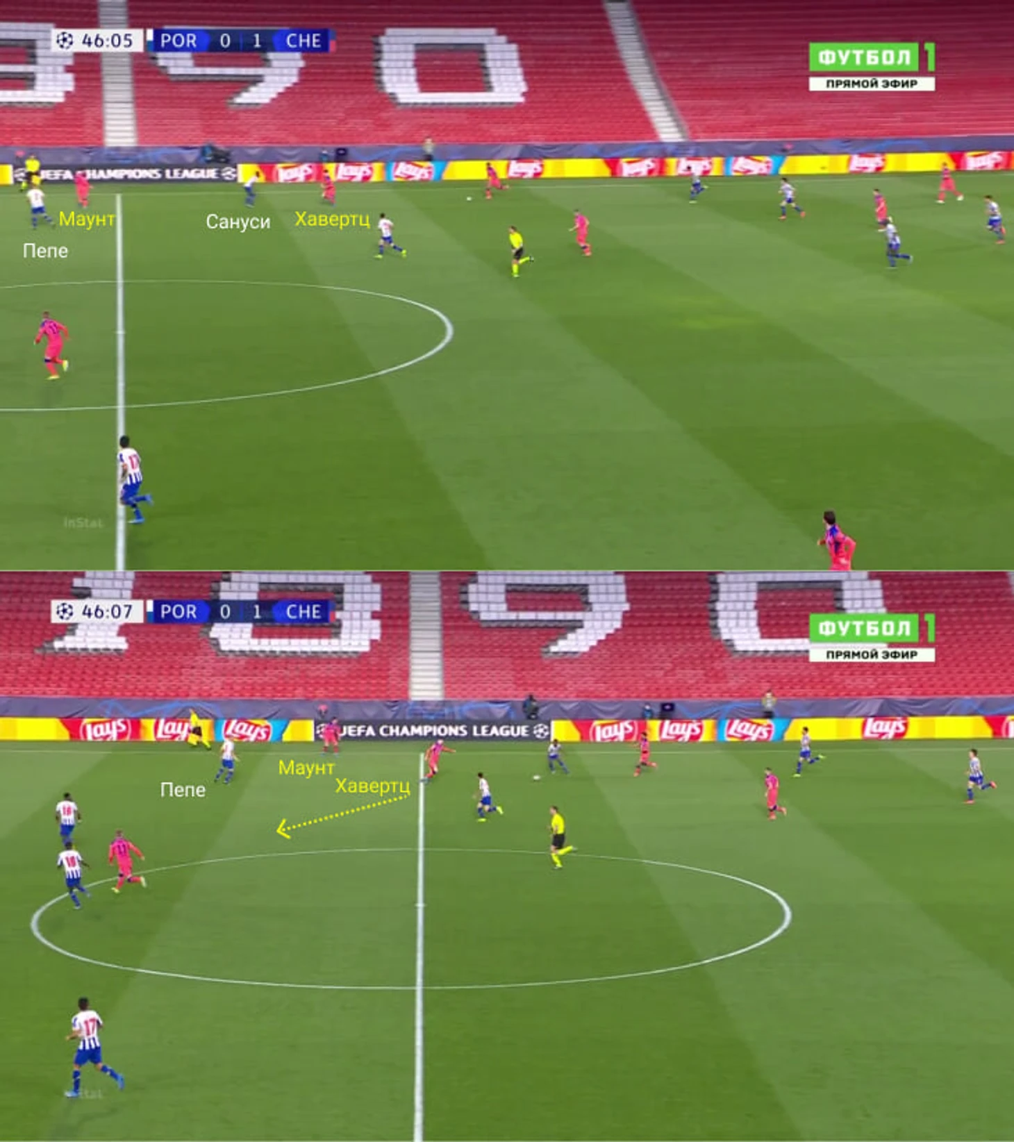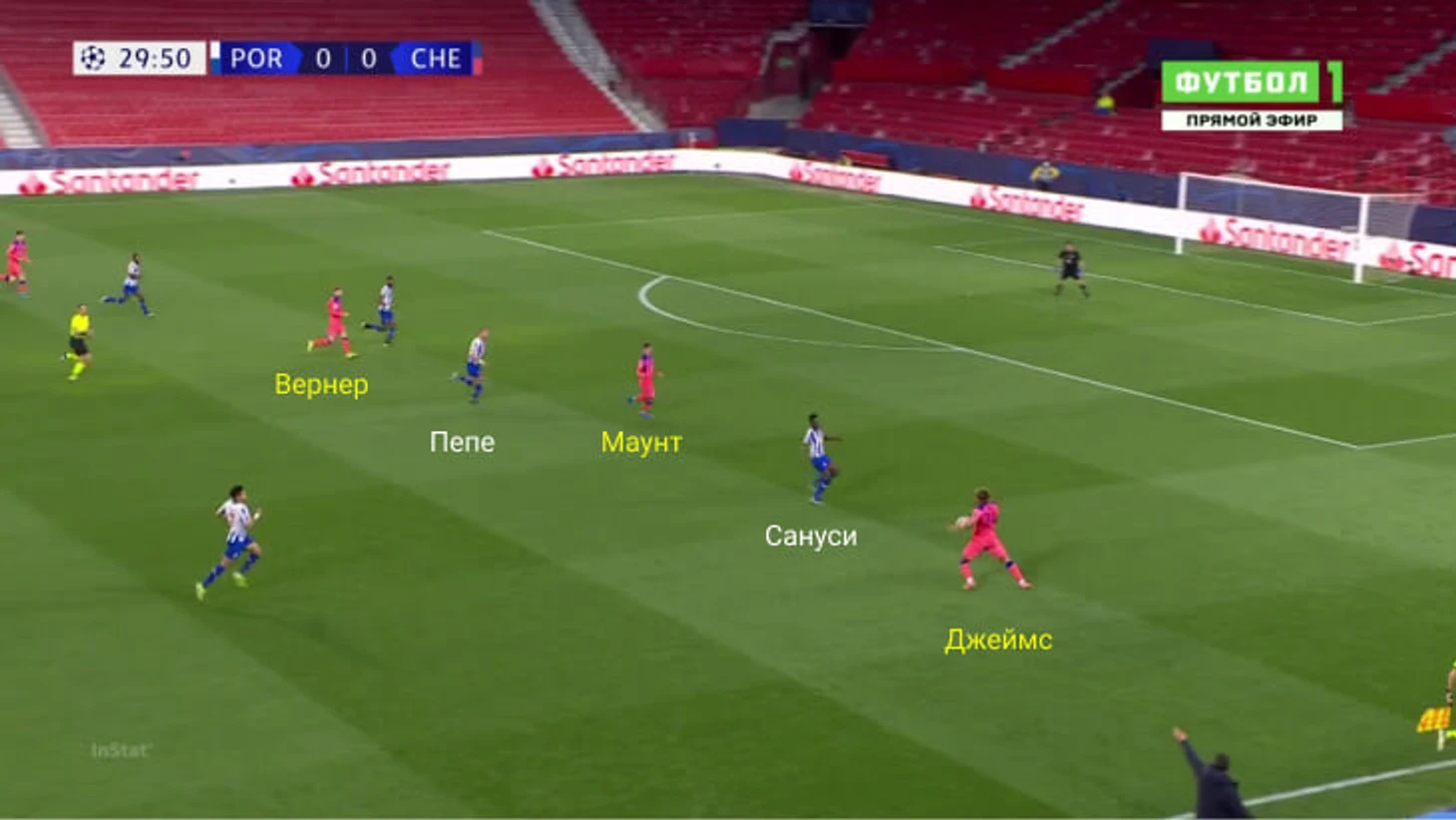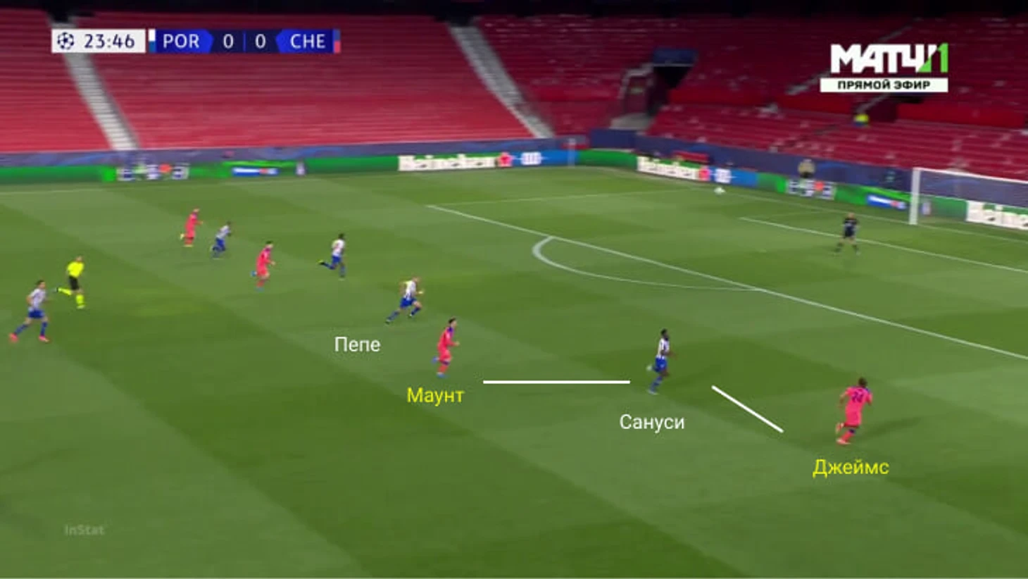 Еще Мэйсон стал главным игроком в первой голевой атаке. Сначала его движение заперло «Порту» на своей половине поля. Здесь он оказался вместе с Джеймсом рядом с Сануси и включился в зону запаздывающего Пепе. Но Рис после приема мяча покатил на Вернера (к этому моменту Мэйсон выйдет из офсайда).