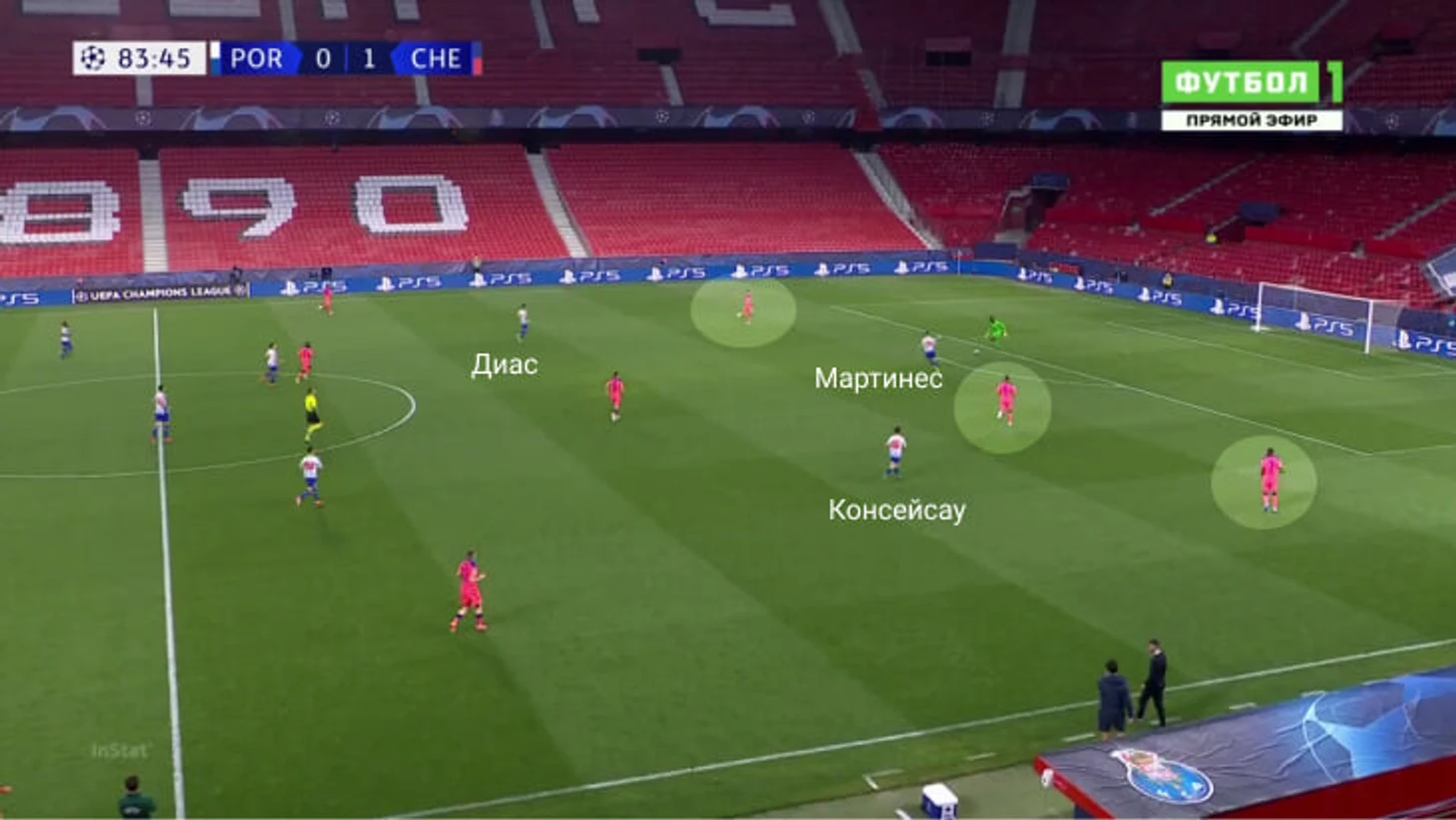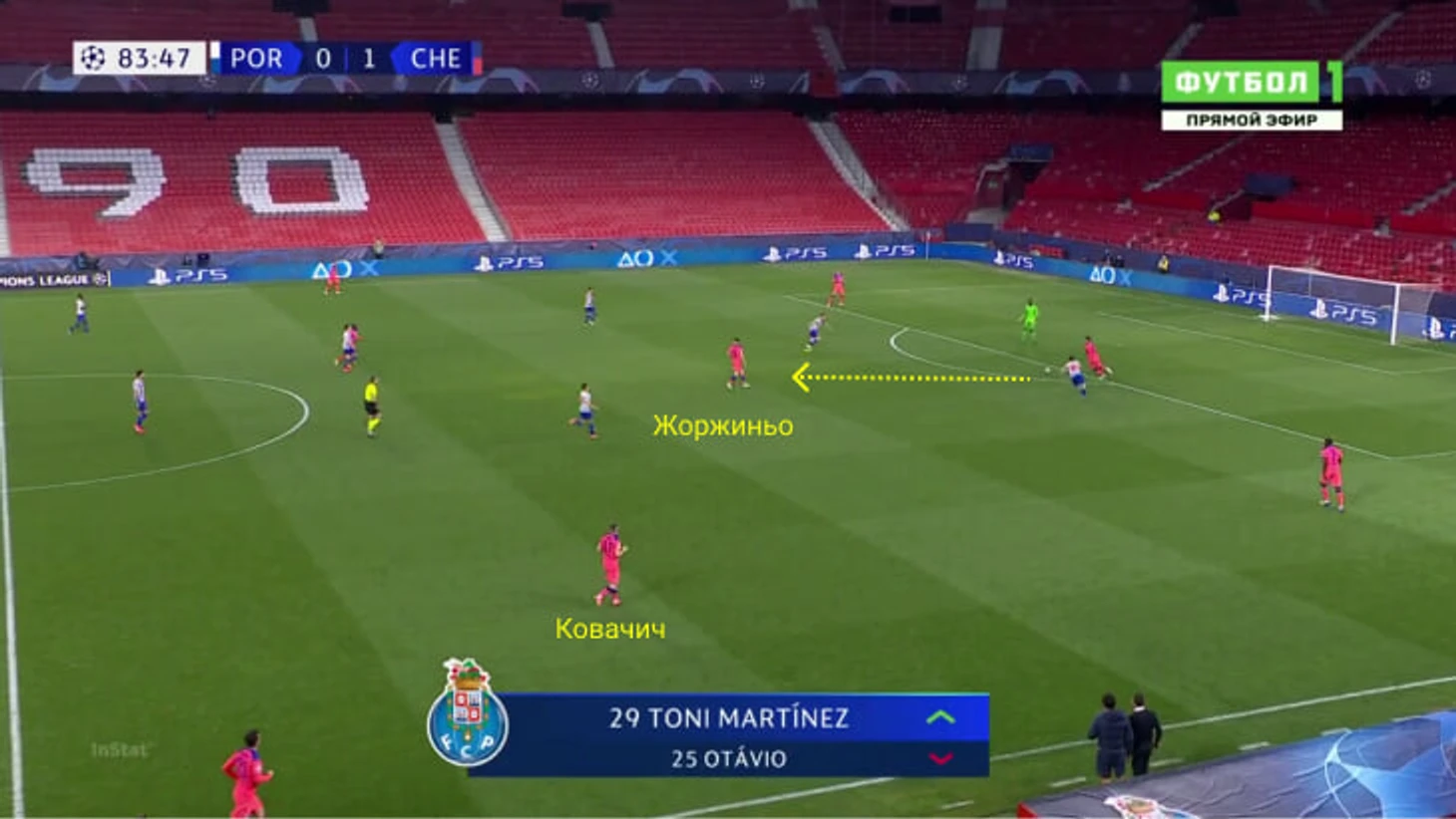 Марега так и не накрыл Жоржиньо (зачем-то выбросился на Ковачича), а левый фланг не приспособился ко второму темпу атаки: Диас и Груйич не успели к опорнику «Челси», а Отавио не прочитал и решение Маунта (мог добавить компактности своим смещением к эпизоду).