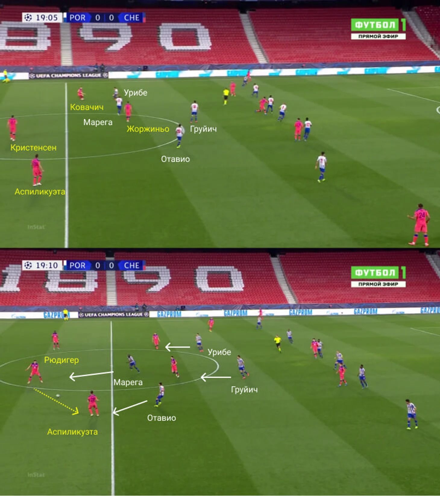 Следующая стадия эпизода: шестерка сохраняется, а «Порту» выгнал «Челси» назад. К Аспиликуэте выдвинулся Отавио, а Марега дожал Кристенсена + гибко сыграли Урибе и Груйич, подхватив Жоржиньо и Ковачича.