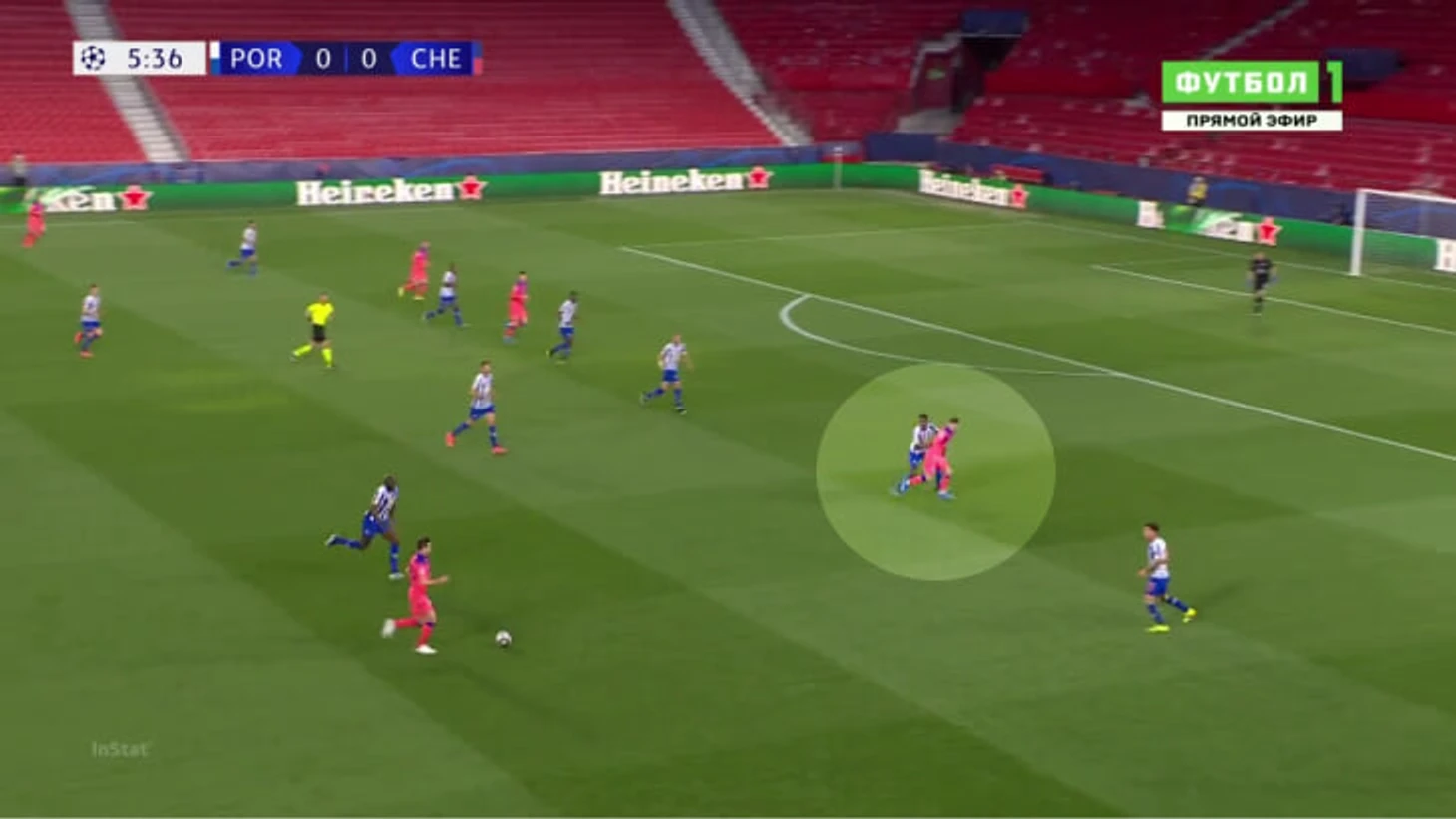 Испанец двигал мяч самостоятельно. Это означало, что «Порту» лишил «Челси» контроля: единственный игрок без опеки – Рюдигер, но он недоступен для перевода, а остальные плотно разобраны. В таком стиле «Порту» оборонялся очень успешно, пока Маунт не включил режим гения (об этом – ниже).
