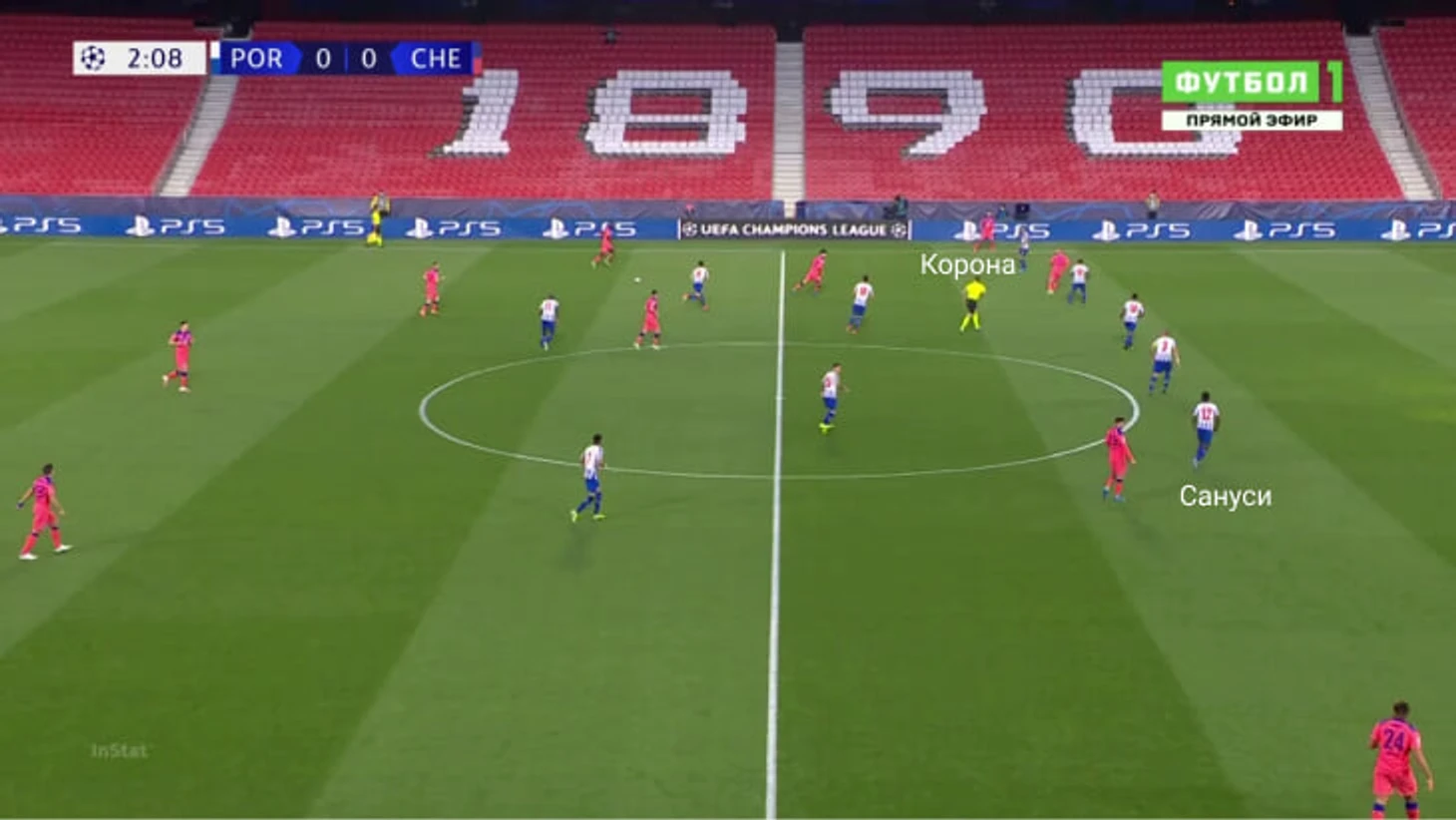 Основная расстановка «Порту» при обороне в низком блоке (португальцы редко высоко прессинговали) – 5-4-1. Корона практически всегда садился пятым в линию, чтобы крайний защитник Манафа играл в створе штрафной и поддерживал узкое расположение между защитниками. Эффект ясен: если «Порту» загонял «Челси» налево, то они давили количеством и подстраховкой из компактного центра защиты. Параллельно штрафной располагался даже Сануси. Отчасти из-за роли Маунта (об этом – позже) + из соображений подстраховки.