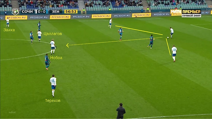 Гол «Сочи» возник из-за совокупности проблем. «Зенит» провалил прессинг: Дзюба и Азмун лишь изображали давление, а Вендел, Кузяев и Малком оказались втроем против четверых. Так «Сочи» прошел первую фазу атаки через пас на Нобоа и заставил «Зенит» откатиться назад.