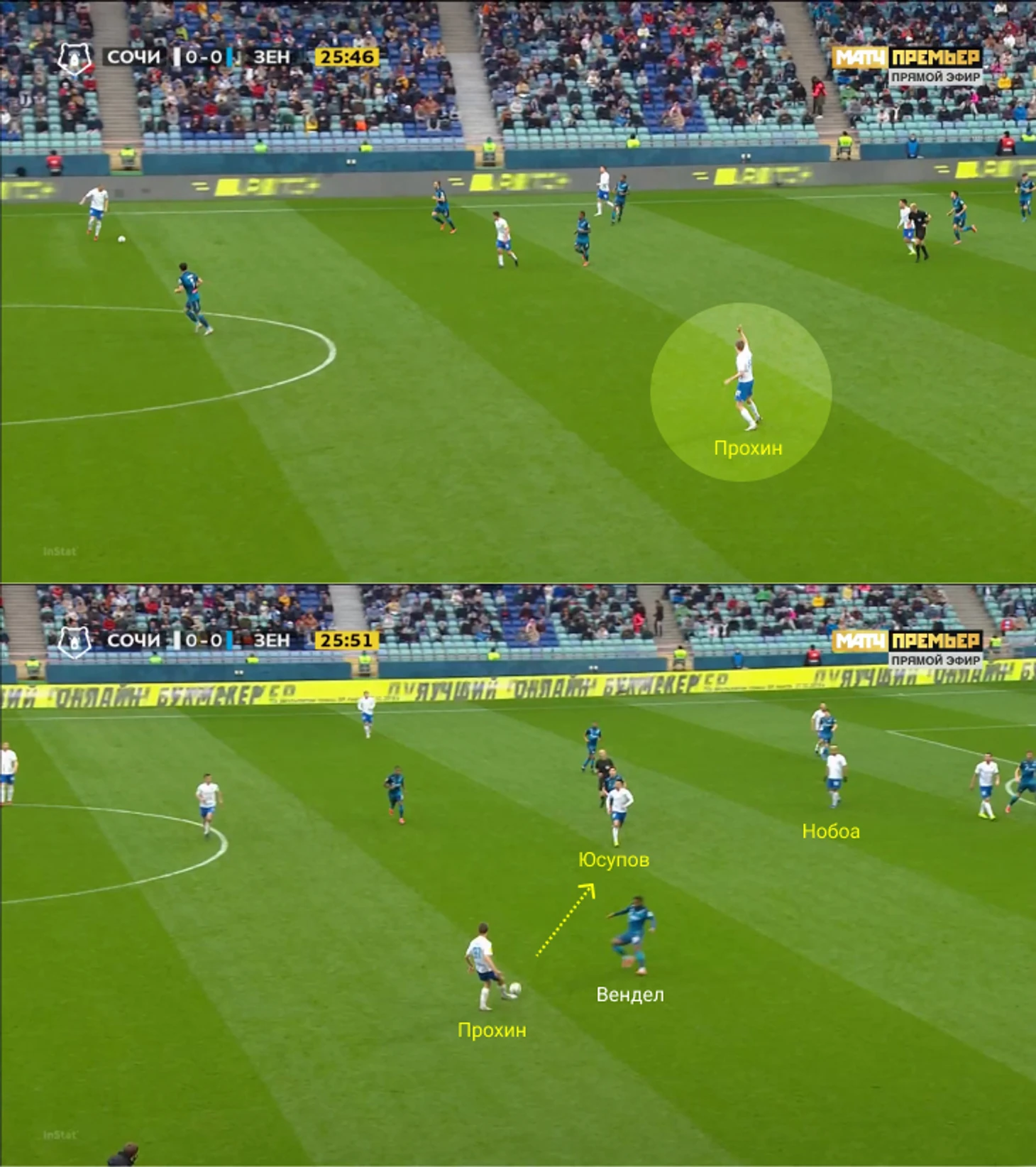 Вот один из самых показательных эпизодов. «Сочи» после долгого владения слева поменял фланг. Вендел опоздал, поэтому у Прохина два варианта: покатить на Юсупова или отдать сложную передачу Нобоа. Данила выбрал вариант проще.