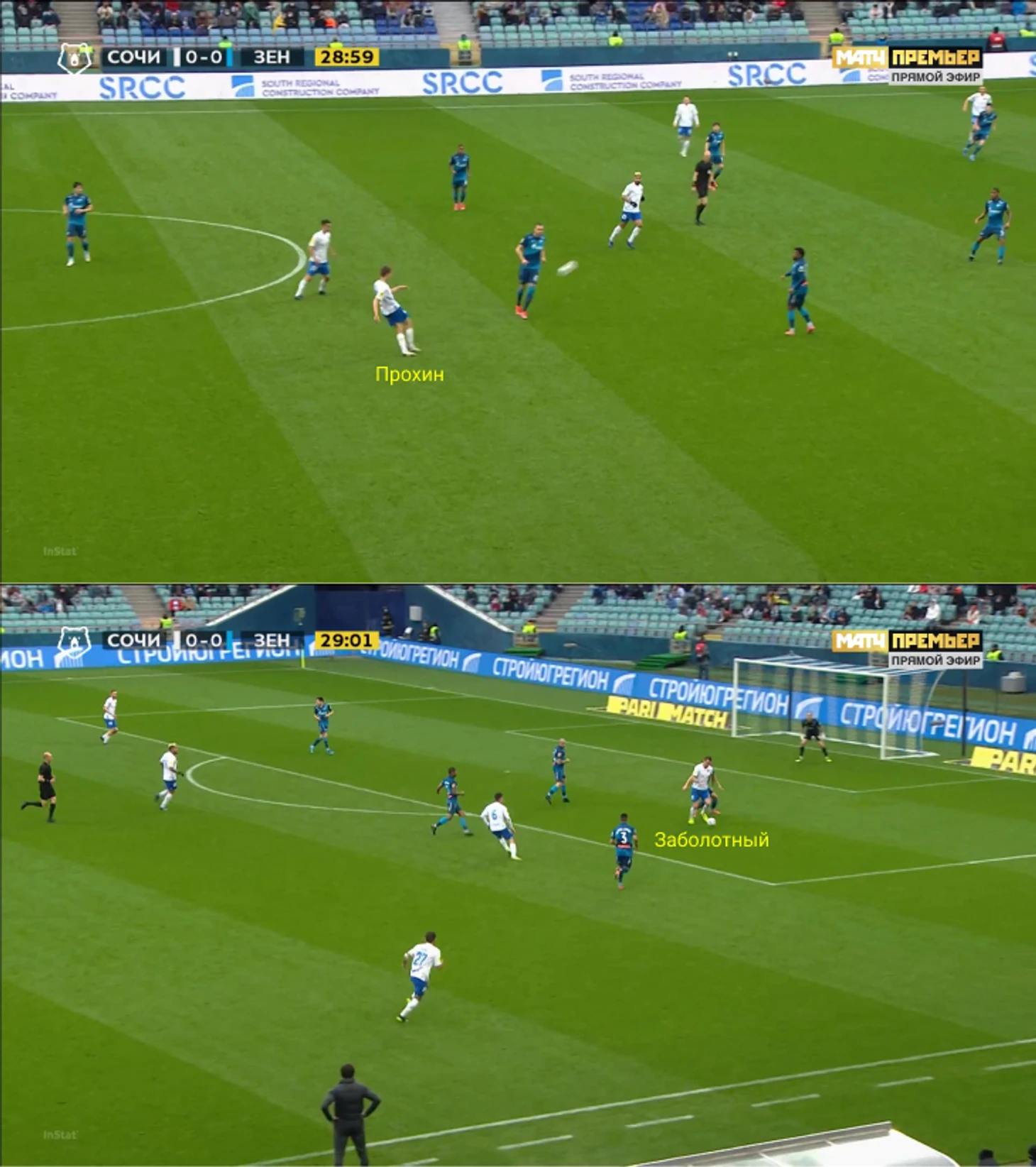 Частично идея понятна: Кузев и Барриос следили за Бурмистровым и Юсуповым, а Малком и Вендел оставались в полупозициях ради Цаллагова и Нобоа, если те действовали высоко (либо играли по крайним центральным защитникам). Но в реальности вышло сложнее: на флангах «Зенит» качественно зажимал «Сочи», но при переводах на другой край часто ошибался. Один из главных героев давления «Сочи» – Данила Прохин. Его важность характеризует показатель xThreat – передачи, увеличивающие шансы забить гол. Прохин вошел в топ-3 матча по пасам в опасные зоны. У него и Ракицкого по 0,31 xT, у Сантоса – 0,41 (но Данила не исполнял стандарты).