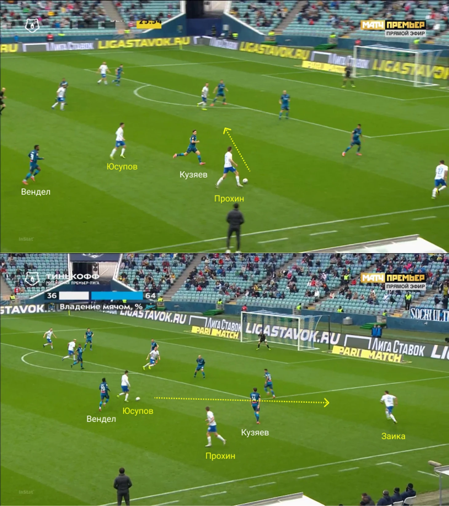 Так и пришел победный гол. «Зенит» устроил традиционный навал, часто подавая с флангов без особого сопротивления, так как Заика часто ориентировался по Венделу – а бразилец скорее играл в полуфланге, чем был полноценным вингером (если таймкод не открылся – момент на 4:14).