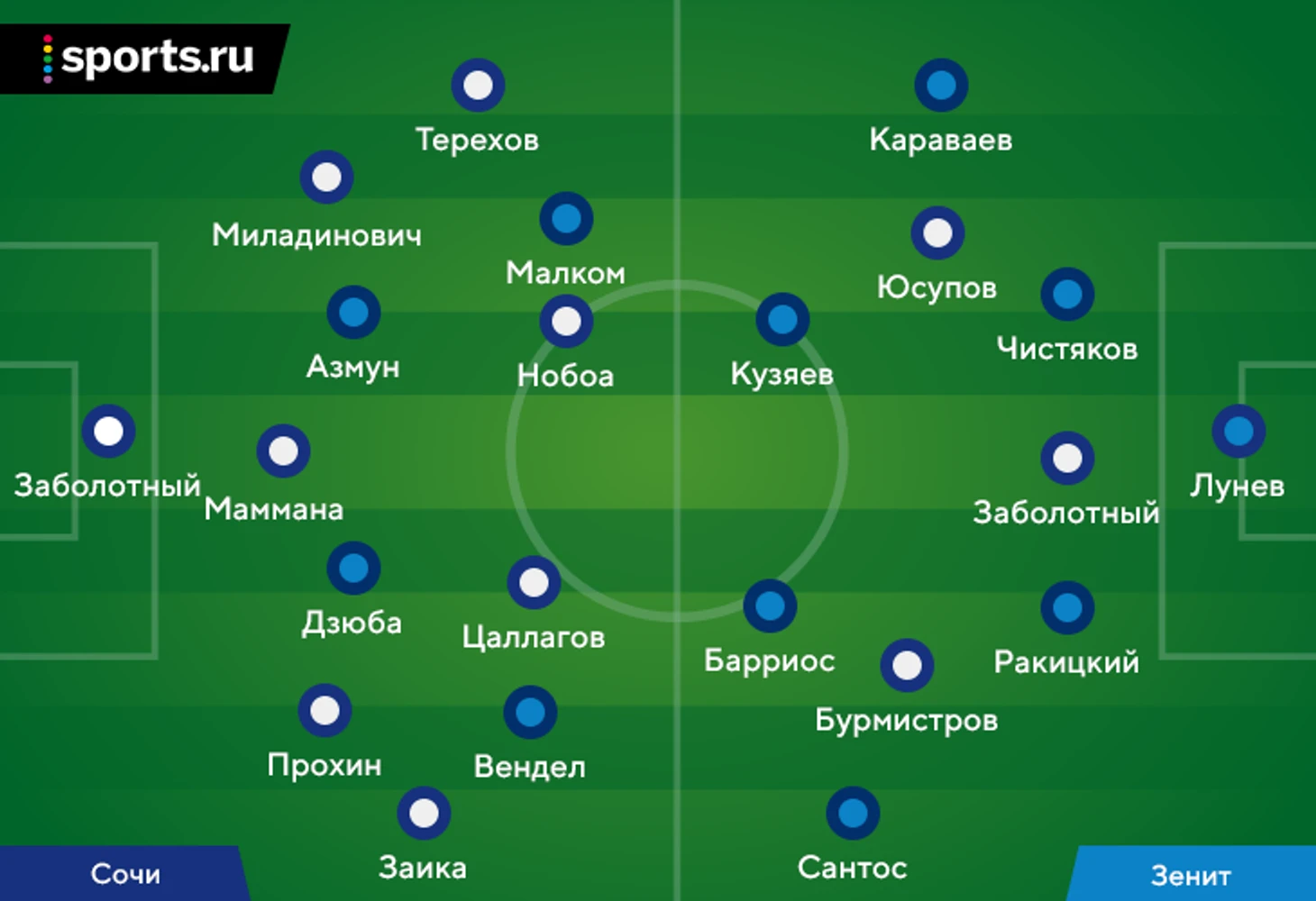 Весной «Сочи» забуксовал: после победы над «Краснодаром» в Кубке отдал очки конкурентам за еврокубки (ничья в Ростове – 0:0, поражения от «Рубина» – 0:1 – и «Локомотива» – 1:3). Так команда Владимира Федотова оказалась на седьмом месте, пропустив «Локомотив», «Динамо» и «Рубин». К матчу против «Зенита» «Сочи» подходил без травмированных Джанаева и Жоаозиньо. Еще в субботу планировалось, что в воротах сыграет Денис Адамов – однако, по словам Олега Фоменко, молодой вратарь отравился, поэтому его заменил Николай Заболотный.