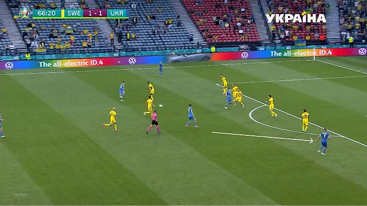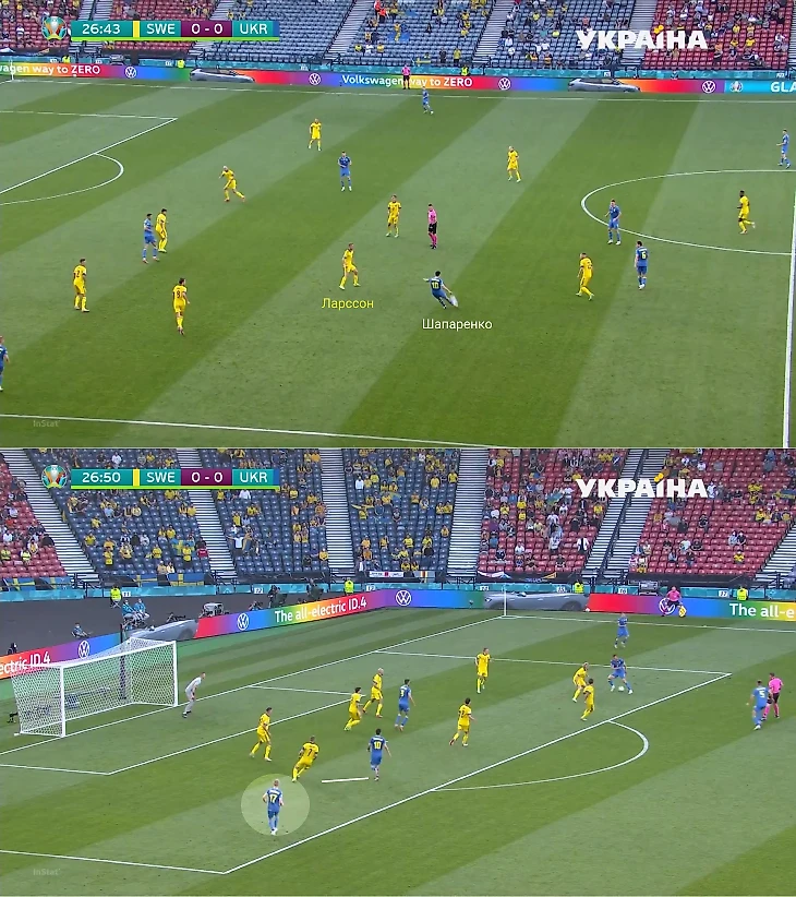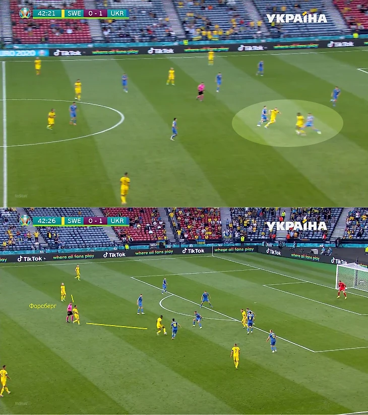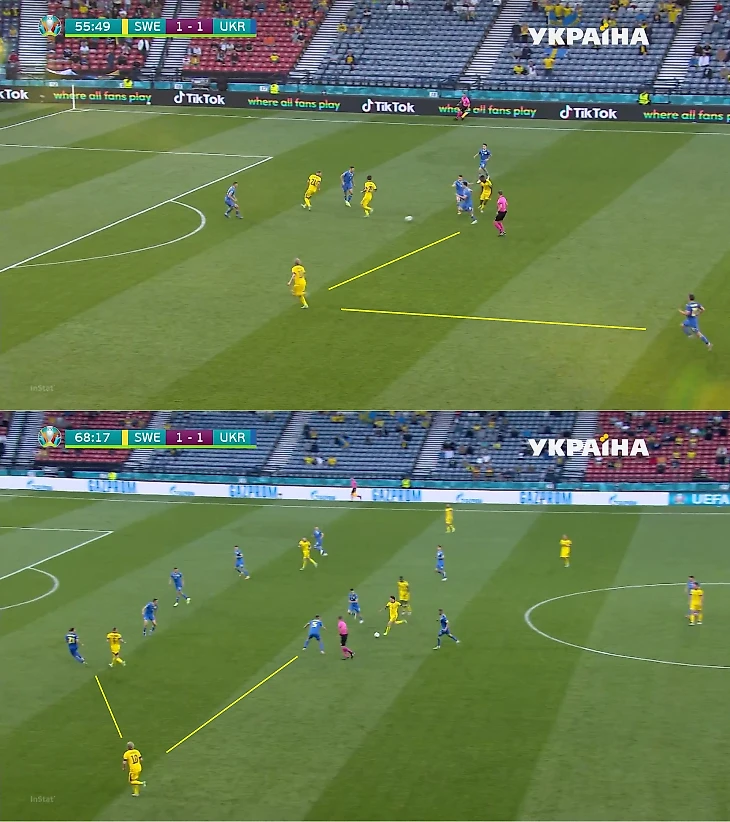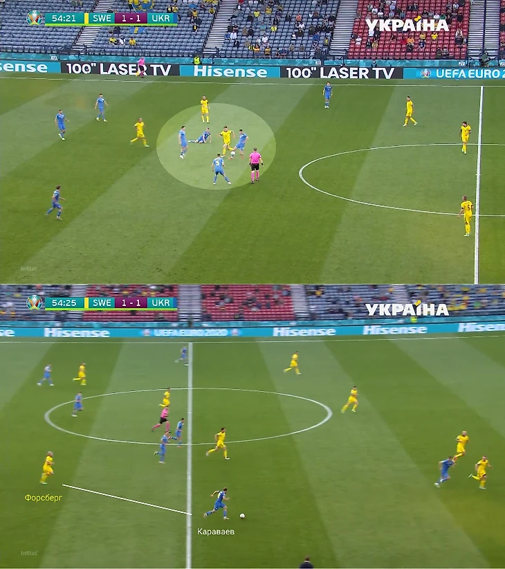 Во втором тайме у Украины было два шикарных шанса. Оба – в быстрых атаках, где важные роли сыграли переходы из центра во фланг. В первой атаке Украина воспользовалась высоким прессингом шведов: часть команды прессинговала до упора, но после выноса Бущана Швеция проиграла борьбу, плюс Караваев убежал от Форсберга, который прессинговал его секундами ранее. Эпизод закончился включением Сидорчука вторым темпом и последующим ударом в штангу.