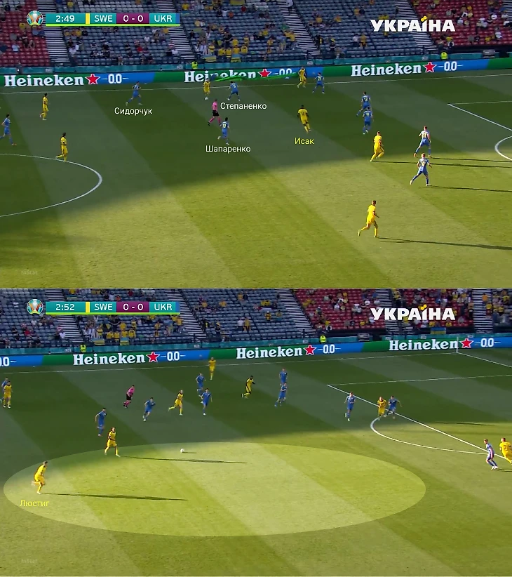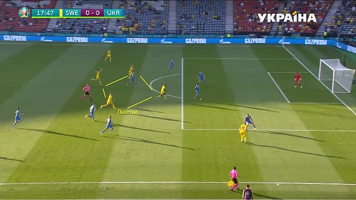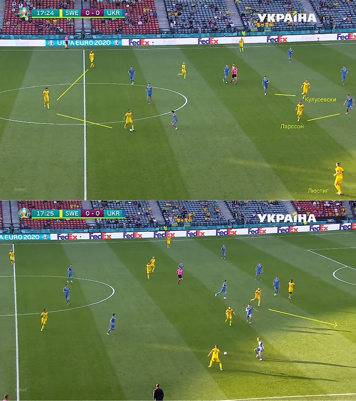Во-первых, во время атак команда Янне Андрессона переходила на тройку защитников. Прессинг Украины практически не мешал Швеции проходить в середину. Плюс ситуация ухудшалась, когда Шапаренко или Сидорчук зеркалили тройку Люстиг-Линделеф-Даниэльссон.
