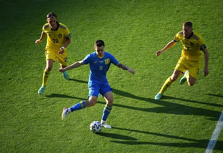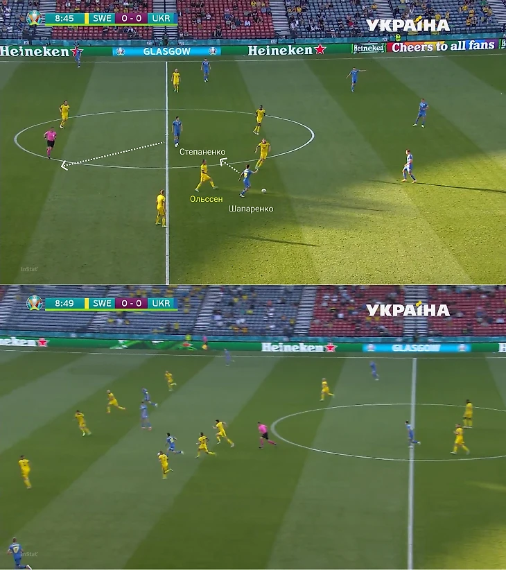 Против Швеции, использующей 4-4-2, переход на тройку казался здравым решением. В теории Украина получала 3-в-2 на стадии выхода из обороны в атаку, плюс возможные 3-в-2 в середине поля. Для Украины вырисовывался неплохой шанс на контроль, но в начале встречи все было не так радужно: Украина почти не комбинировала, а шведы владели инициативой.