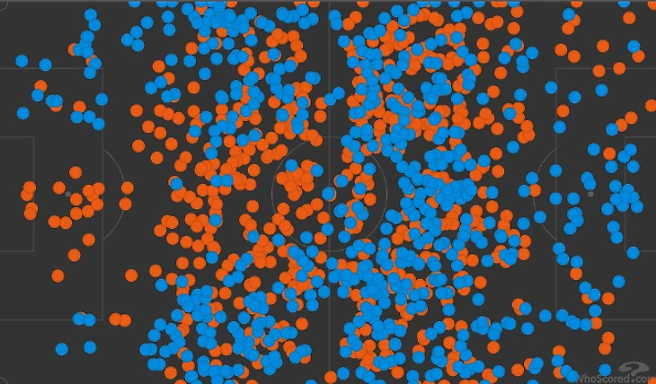 Но защитники часто подчищали в последний момент. Швеция хорошо контролировала мяч на подступах к штрафной, но плохо его туда доставляла. Ниже – карта касаний в первые 90 минут (Швеция обозначена оранжевым, ворота Украины – справа). Навесы были неэффективными (21 вынос от украинцев).