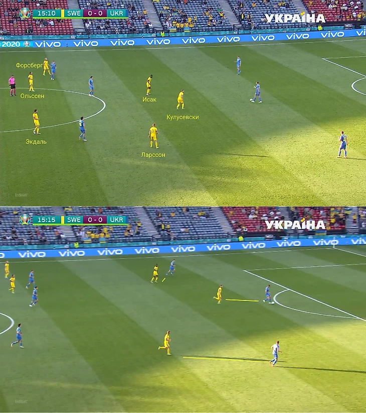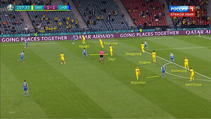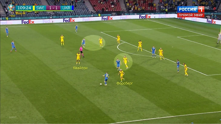 Вот пример: Классон страхует Крафта, выдвинувшегося на Зинченко, Линделеф ушел за Цыганковым. Чтобы пространство не пустовало, туда сместился Экдаль, закрыв дополнительный коридор. Еще важен Форсберг, он пришел в центр за Сидорчуком. По сути, Украина не имеет численного преимущества в центре, хотя играет в большинстве.
