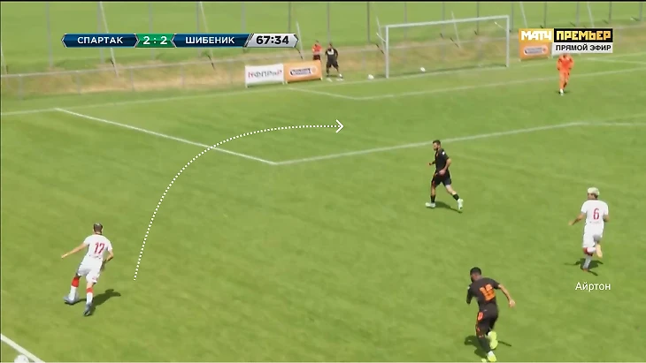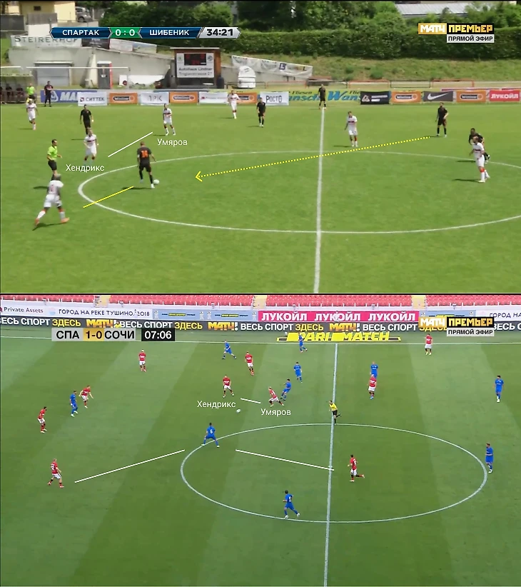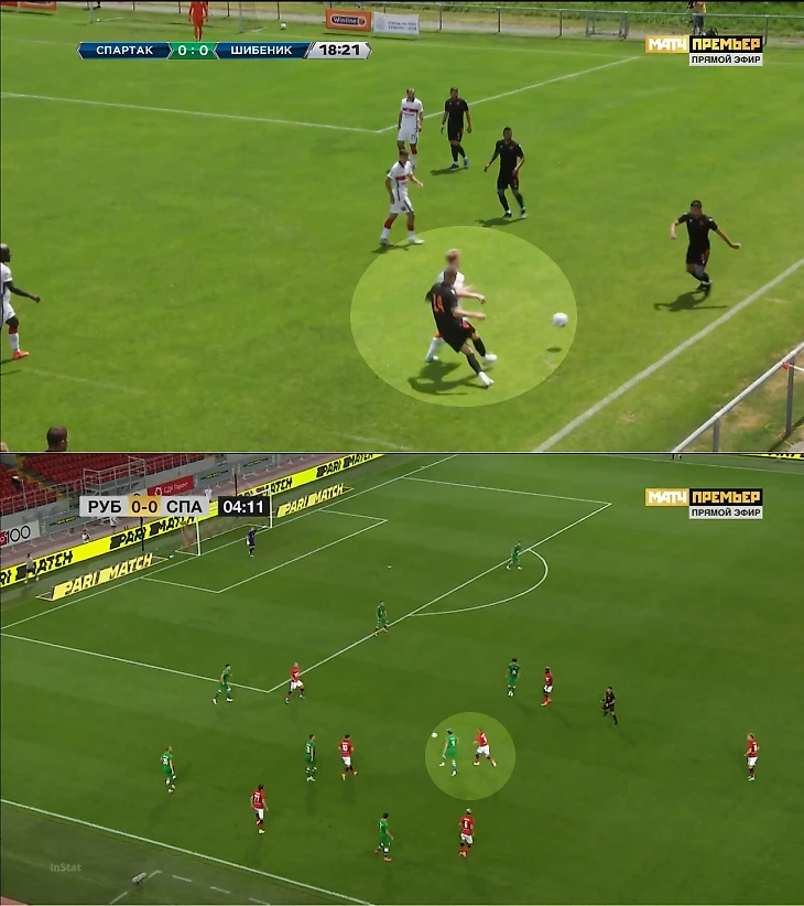 Вот примеры из матчей с «Шибеником» и «Сочи». В каждом из случаев «Спартак» компактно поджимал соперников, но в первом эпизоде Мозес застрял на фланге, а во втором – Бакаев не вернулся назад. В Австрии «Шибеник» просто продолжил владеть мячом, а в Москве подстраховал Рассказов, сохранивший узкую позицию.