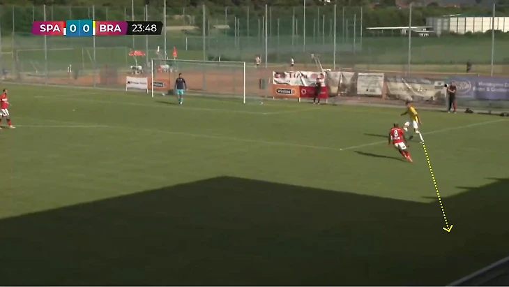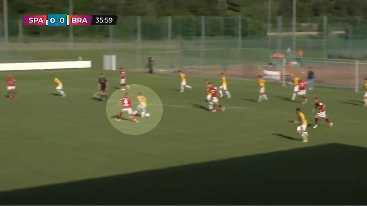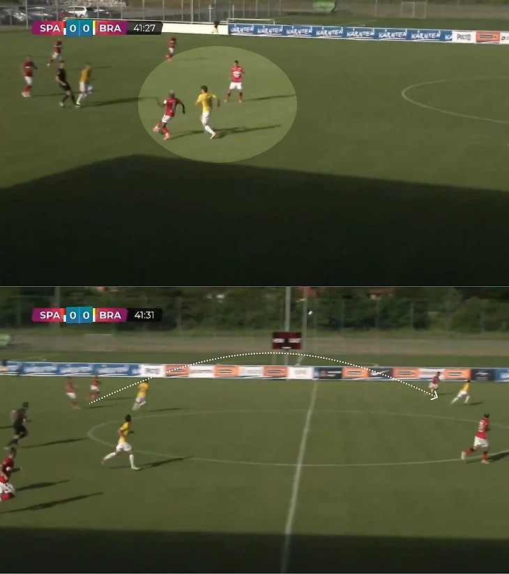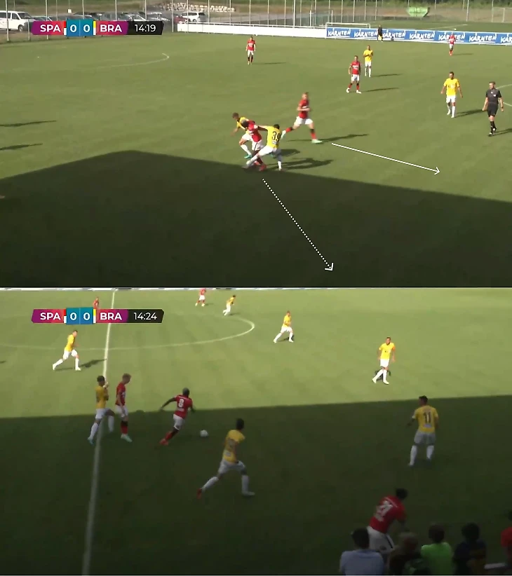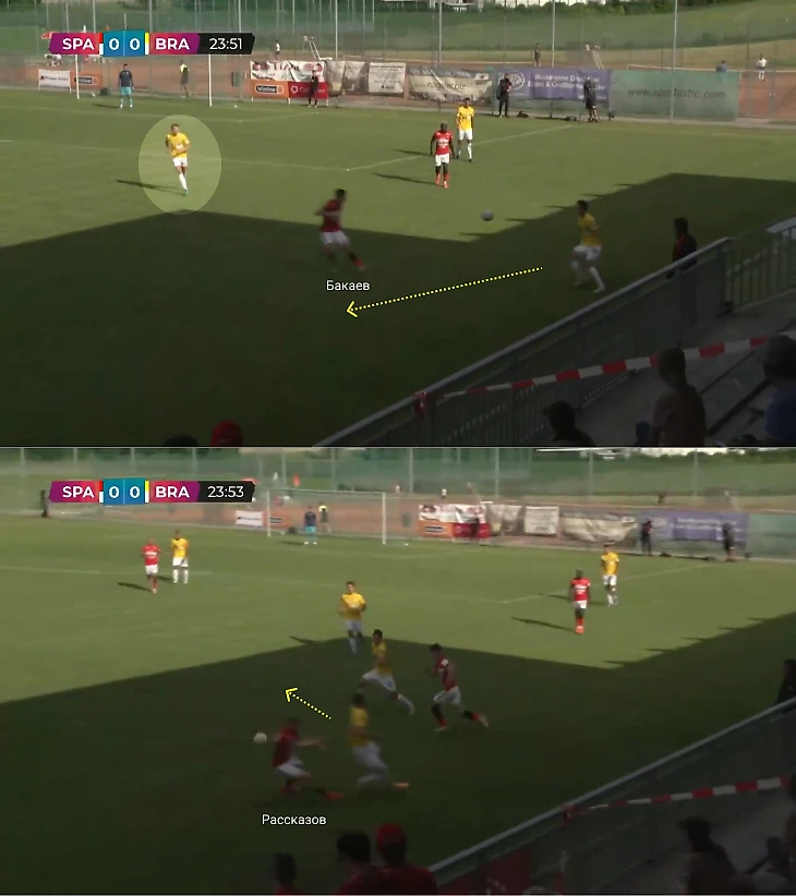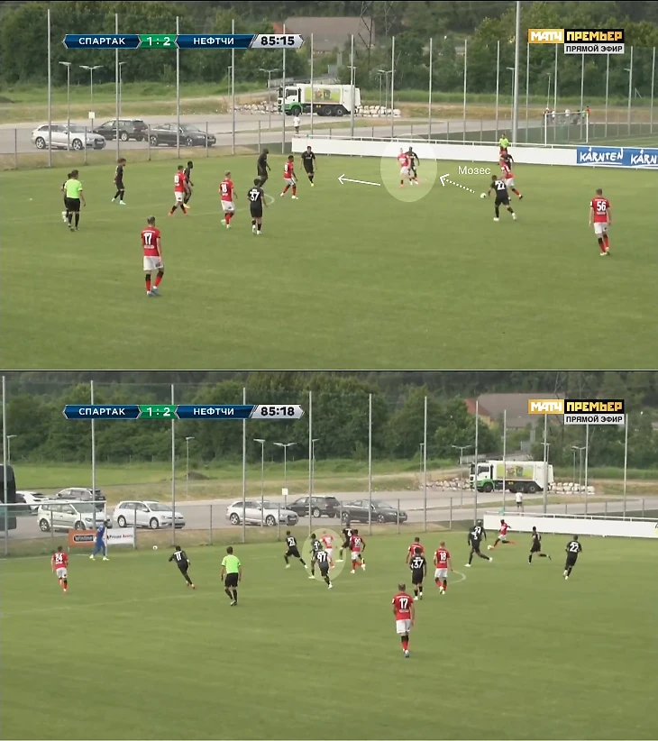 Но проблемы в давлении были на двух сборах. «Браво» создавал проблемы за счет схемы. Словенцы использовали 3-4-3 и пользовались ситуативными тройками в нападении от «Спартака». В том матче Мозес выбрасывался на одного из крайних центральных защитников, а один из форвардов грузил Рассказова. Так у «Браво» освобождался латераль – команда проходила прессинг через него.