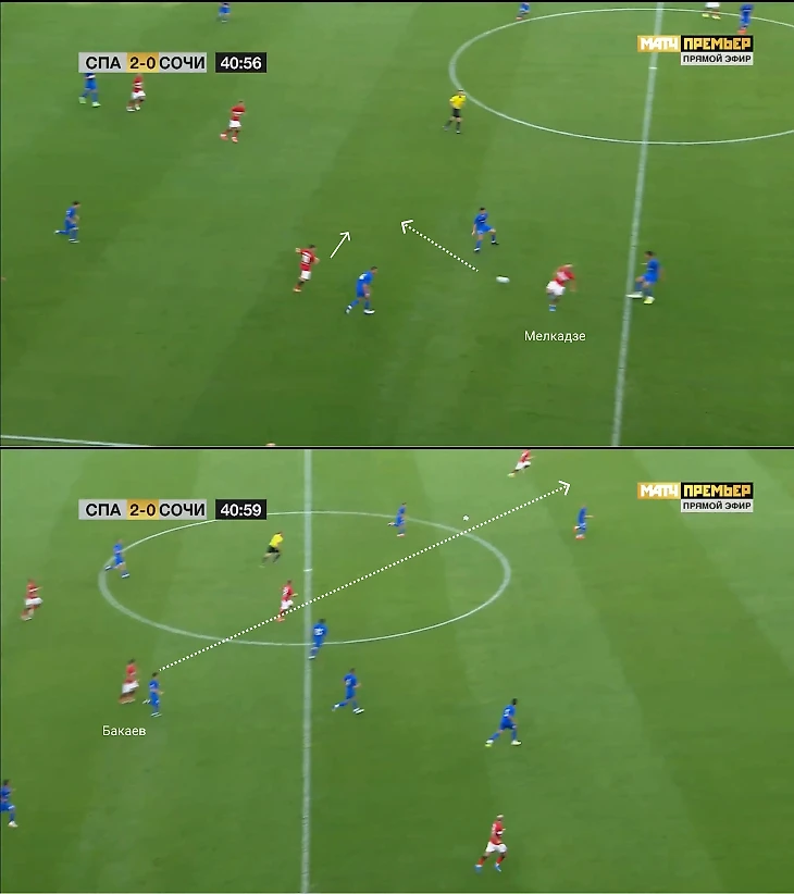 Дальше было три детали, которые раскрывали «Спартак». Первая – Бакаев бросался из центра на фланг. Как правило, он немного опаздывал, поэтому было два эффекта. Сначала освобождался игрок в центре, затем он позволял латералю легко принимать мяч.