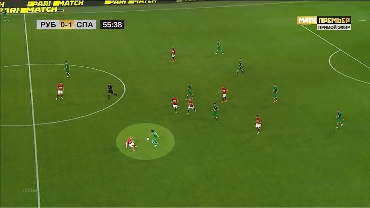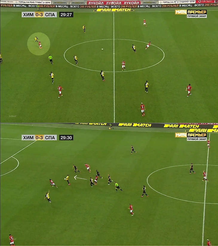 Важная деталь – «Спартак» очень часто использовал крайних защитников как инструмент сужения при обороне. В этом эпизоде так сделал Ещенко – Андрей сблизился с парой защитников и страховал ситуацию, став дополнительным адресатом для передачи.