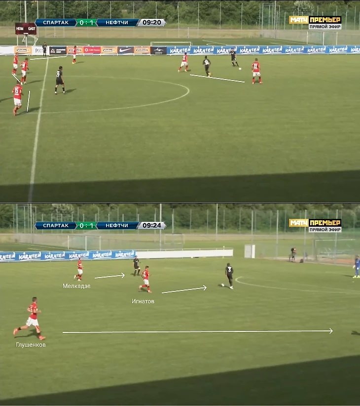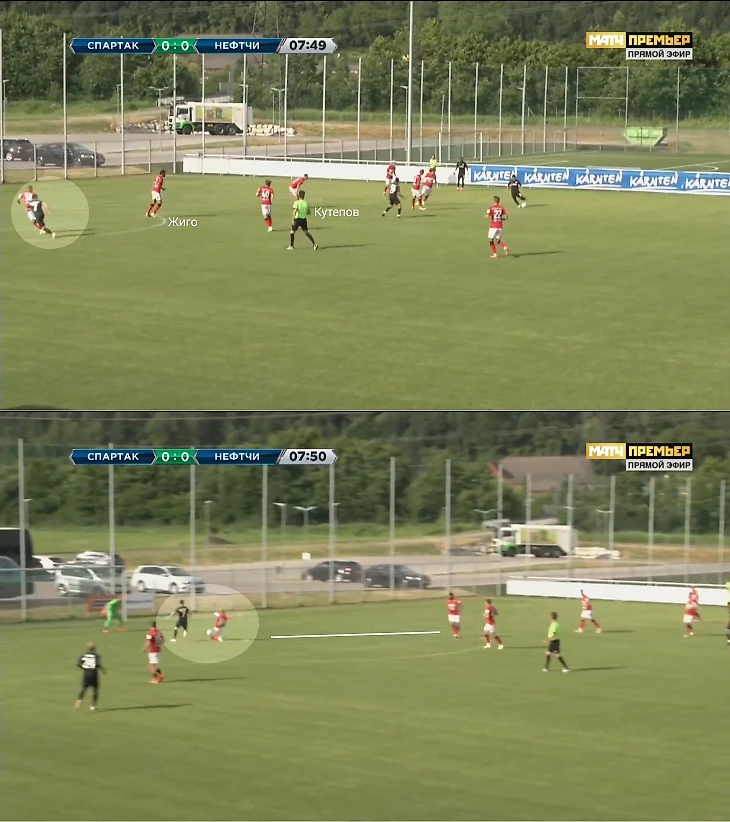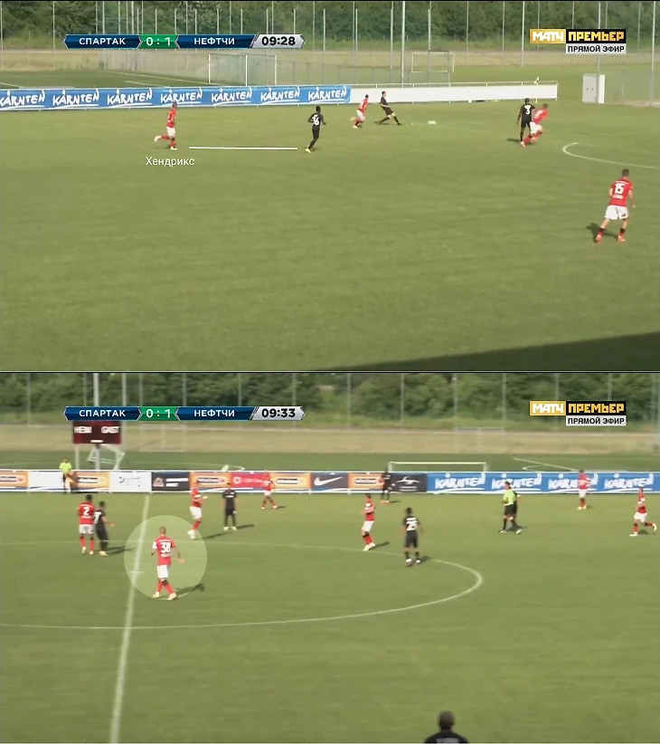 Следующая стадия – готовность к максимально высокой линии защитников. Сначала Хендрикс выдвинулся к опорнику «Нефтчи», а четверка защитников поднялась к центру поля (характерная черта «Спартака» на первом сборе).