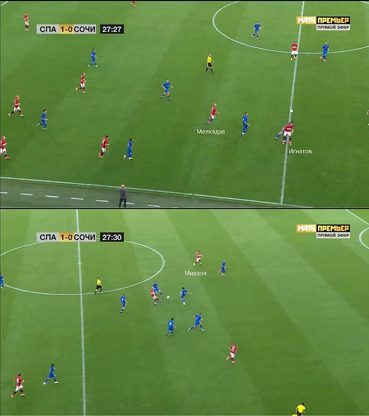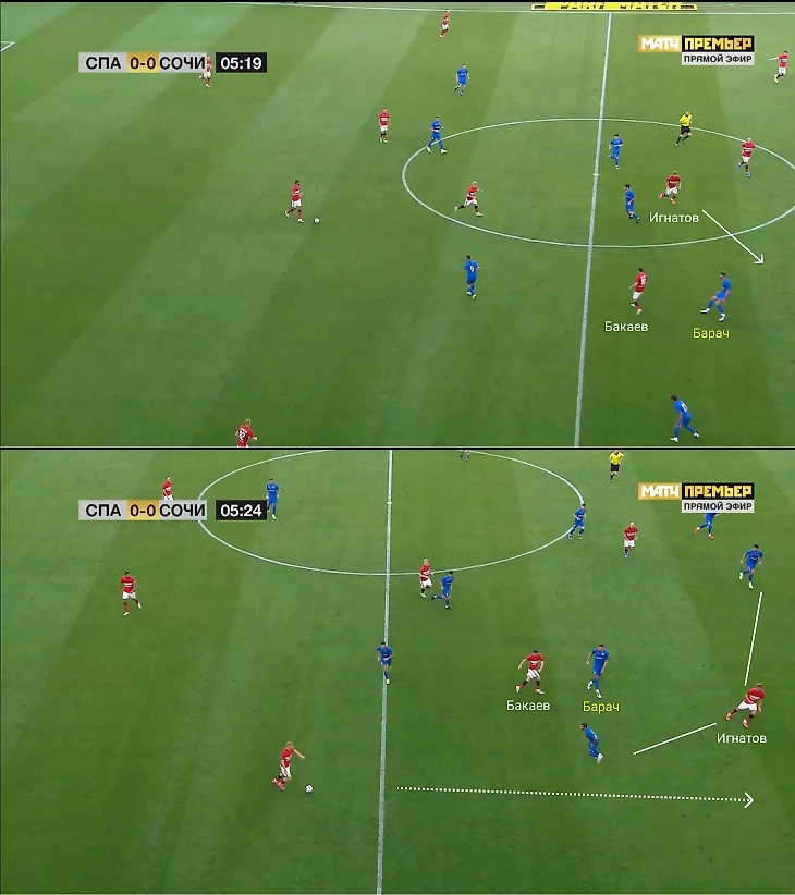 Редкий пример высокого прессинга из матча в «Сочи». Для «Спартака» комфортны фланговые ловушки: Мелкадзе и Игнатов сыграли по ближним центральным защитникам, а спартаковская четверка полузащитников расположилась компактно.