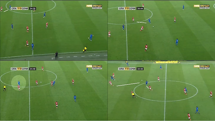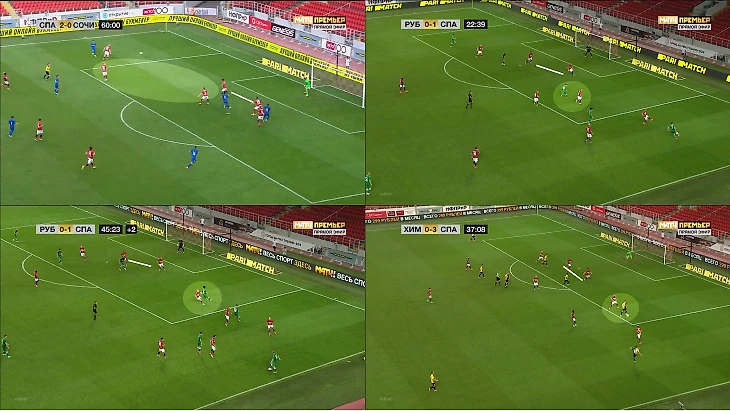 Из-за проблем во время таких забегов московская команда была чувствительна к переводам с одного фланга на другой. Одна из причин – смещение центральных полузащитников к эпизоду, плюс опоздания вингеров. В идеале (как в первом примере из матча с «Сочи») все работало неплохо. Но пока отработано не идеально.