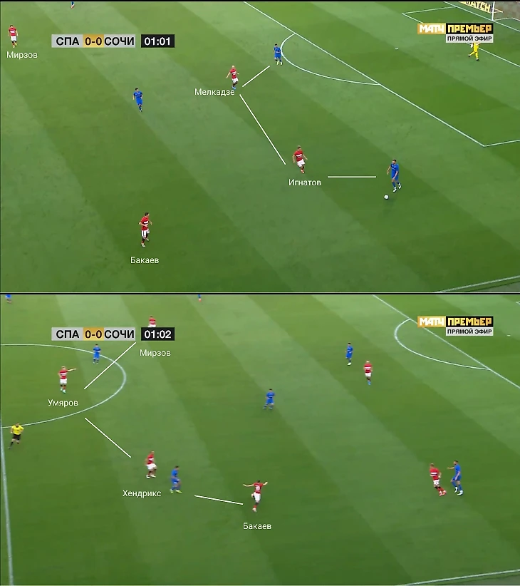 Одно из условий – смещение вингера с противоположного фланга к центру (в данный момент – Мирзов). Это позволяло Хендриксу и Умярову быть ближе к эпизоду. Итог – перехват Бакаева и опасный момент. Деталь – Бакаев на сборах совершил несколько таких перехватов (например, во время второго гола «Сочи»), балансируя между привязкой к флангу и смещением в центр.