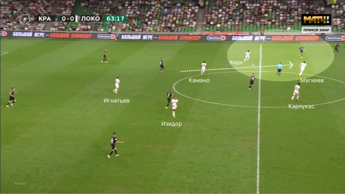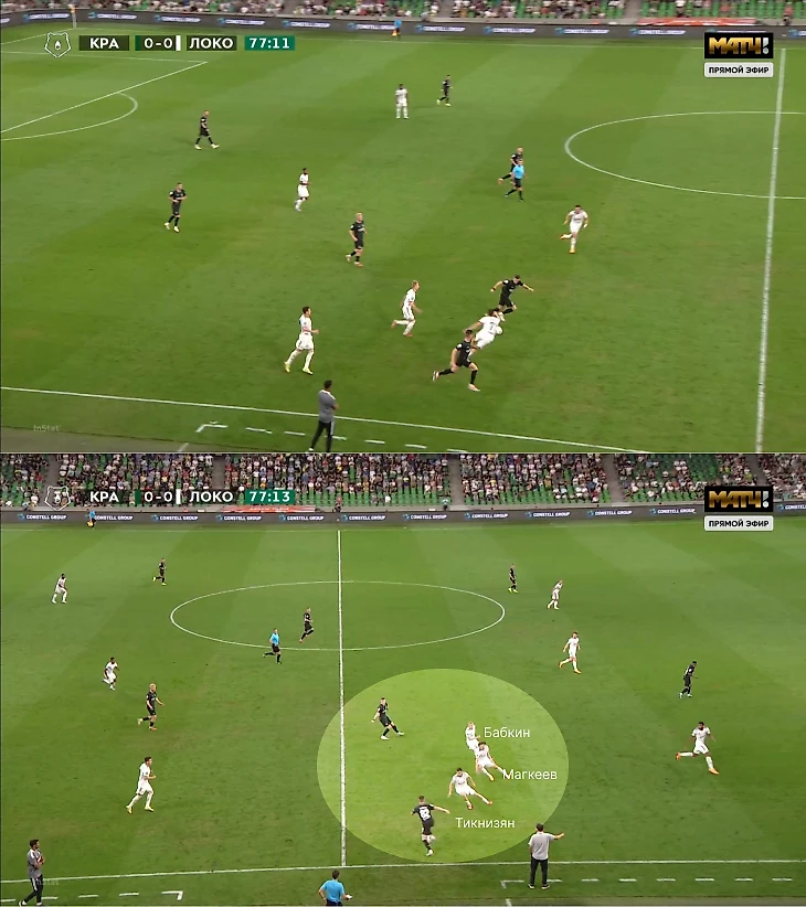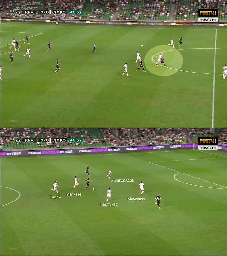 В-третьих, контрпрессинг «Локо» обеспечил пространство перед первым голом «Краснодара». Да, нужно учитывать, что вряд ли Рамирес так положит хотя бы в 5 случаях из 10, но здесь важен принцип – команда ужасно сгруппировалась на фланге перед поперечной передачей.