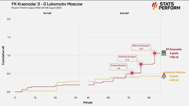 Поводов ждать красивый футбол в матче «Краснодар» – «Локомотив» почти не было. Например, команда Сторожука шла пятнадцатой по ожидаемым голам с игры, последней по ударам из штрафной, а реже в чужую штрафную входили только «Химки», «Пари НН» и «Торпедо». «Локомотив» был чуть лучше при владении, но качество оставалось сомнительным (входил в финальную треть и штрафную всего на 3 раза чаще) плюс практически не бил после позиционных атак.