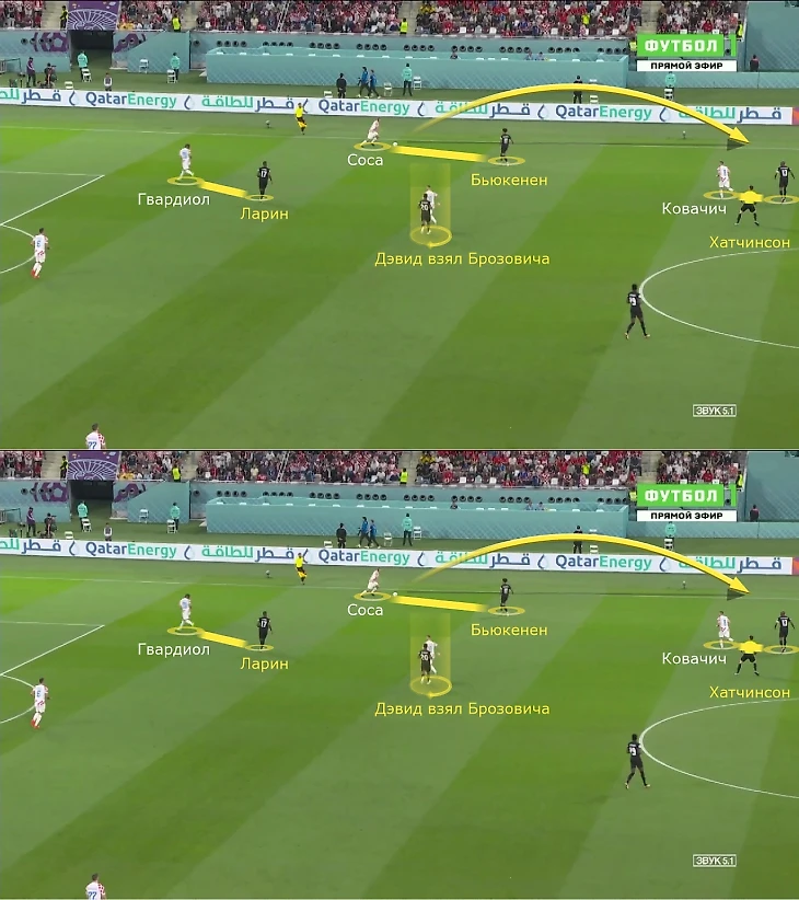 Во-вторых, прекрасно работало движение остальных. Отмененный гол Хорватии интересен движением Брозовича: нападающие его не подхватили, а опорники не подстраховали пространство (Эуштакиу выбросился на фланг, Хатчинсон был вдалеке от эпизода), поэтому Марцело легко откликнулся на передачу Модрича и вывел нападающего на ударную позицию.