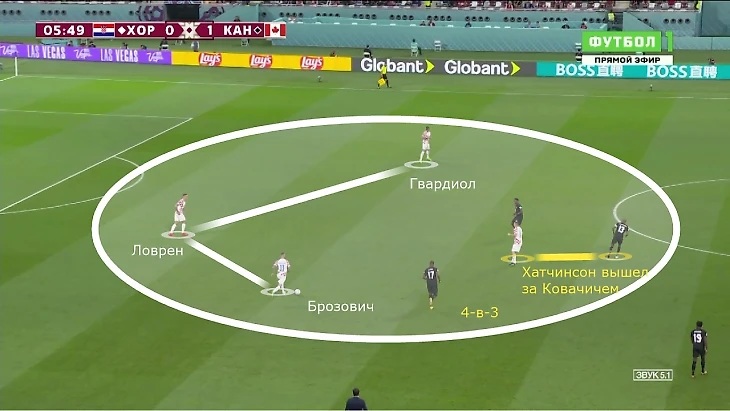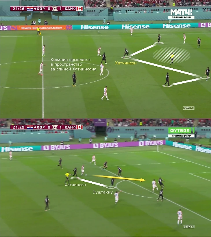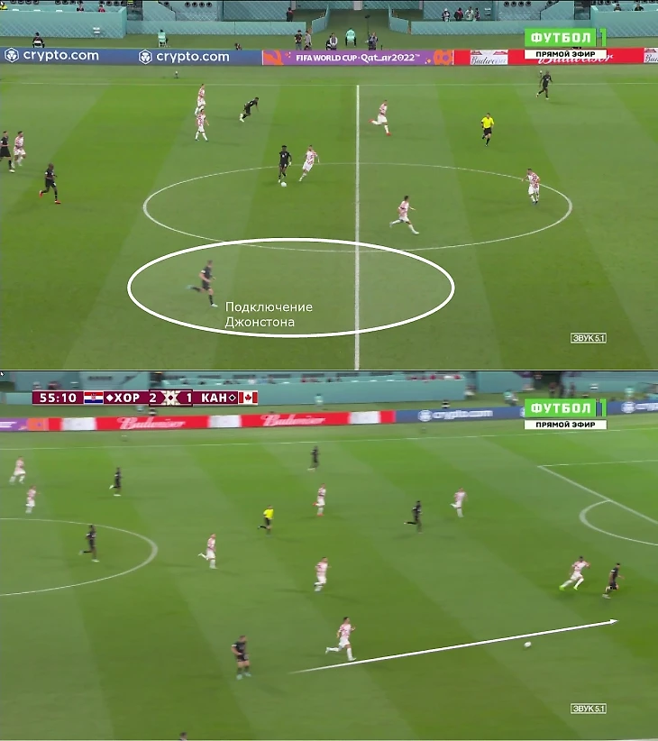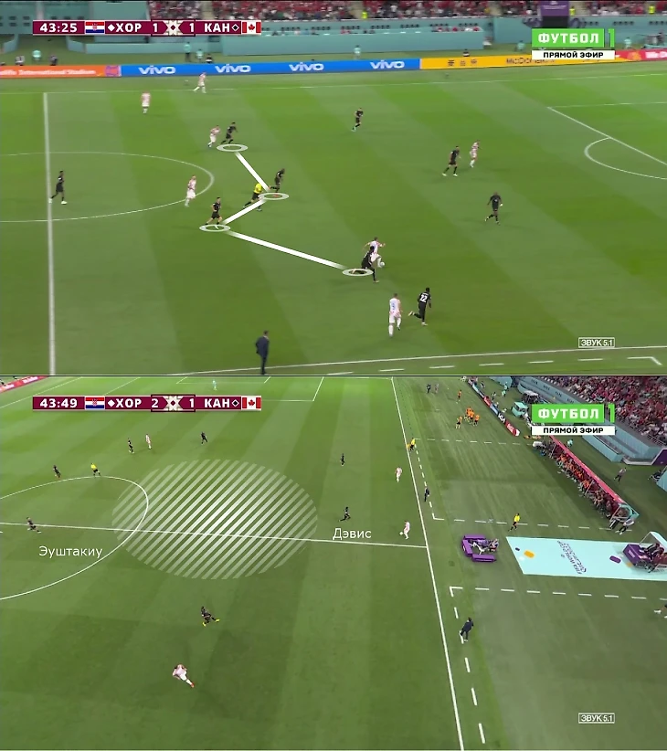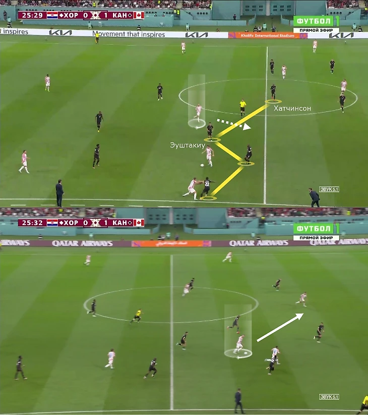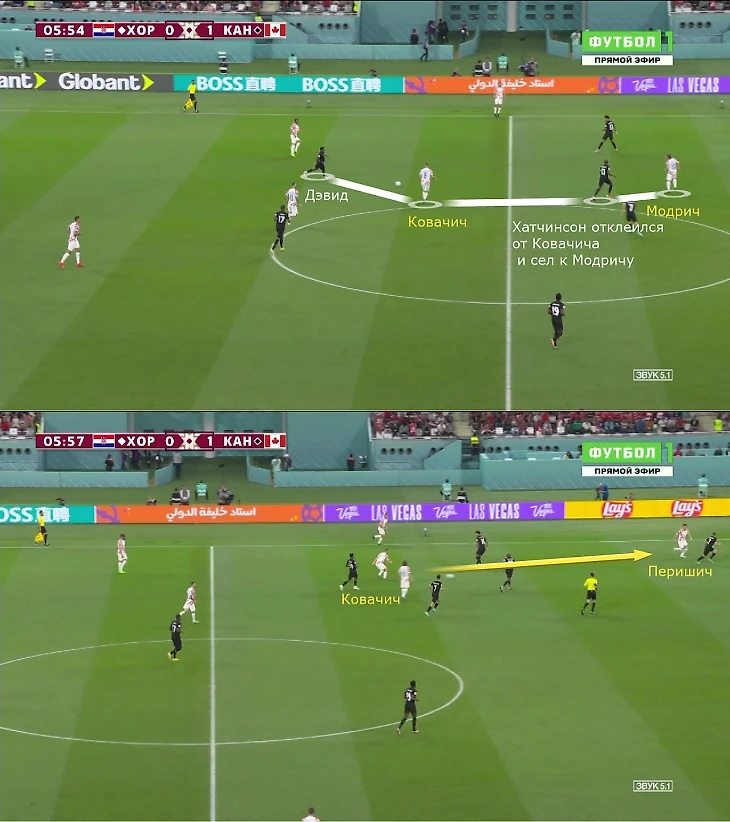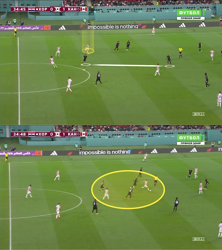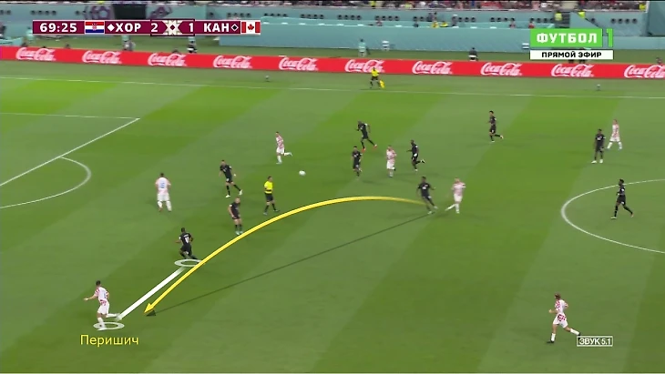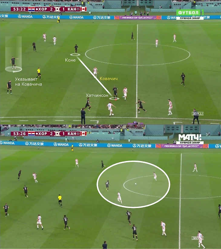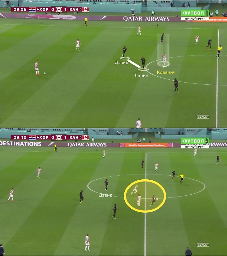 В одном из эпизодов Канада успешно поджала Хорватию (потенциальный выход один на один превратился в офсайд), но при этом намечался главный тренд – свобода восьмерок команды Далича: Дэвид не перестроился под Ковачича, поэтому смещение Модрича в глубину обеспечило Матео возможности для рывка (перевел налево под прострел Перишича).