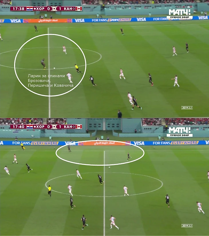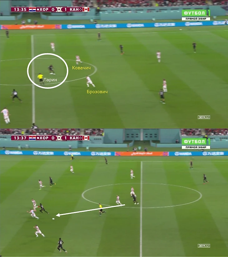 При этом Канада предлагала интересные решения в каждом из таймов. Стартовые 45 минут показали, что прессинг Хорватии достаточно разрознен. Изначально команда поддавливала в 4-3-3, но постепенно Модрич перешел на первую линию прессинга. Когда хорватская команда не успевала накрыть или вовремя откатиться, помогало движение канадцев между линиями. Например, Дэвис уходил с фланга или один из нападающих открывался в глубину. В этом эпизоде за спинами Ковачича и Модрича открылся Ларин, но затем отдал ужасную передачу, которую проконтролировал Юранович.