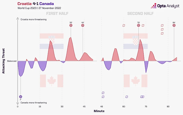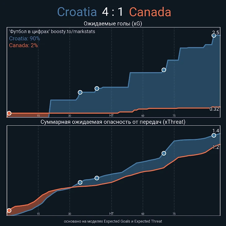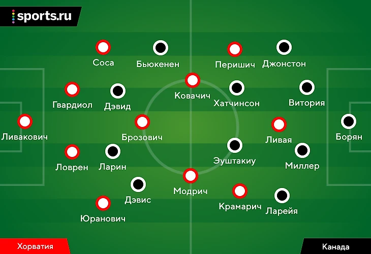 С 20-й минуты до перерыва Хорватия перешла в режим доминирования: вела 4:0 по ударам, допустила всего одно действие с мячом в своей штрафной (Модрич отобрал), при равном владении запирала Канаду на ее трети (14-34 – передачи на трети Хорватии, 46-50 – в средней, 56-20 – на канадской).