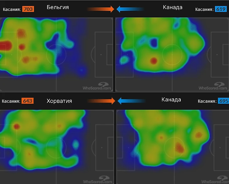 Во втором туре расклад поменялся: 26% – на трети Хорватии, 43% – в середине, 31% – на трети Канады. Хорватия неплохо давила на левом фланге и вынудила канадцев играть глубже (высота обороны против Бельгии – 50 метров, с Хорватией – 44,28).