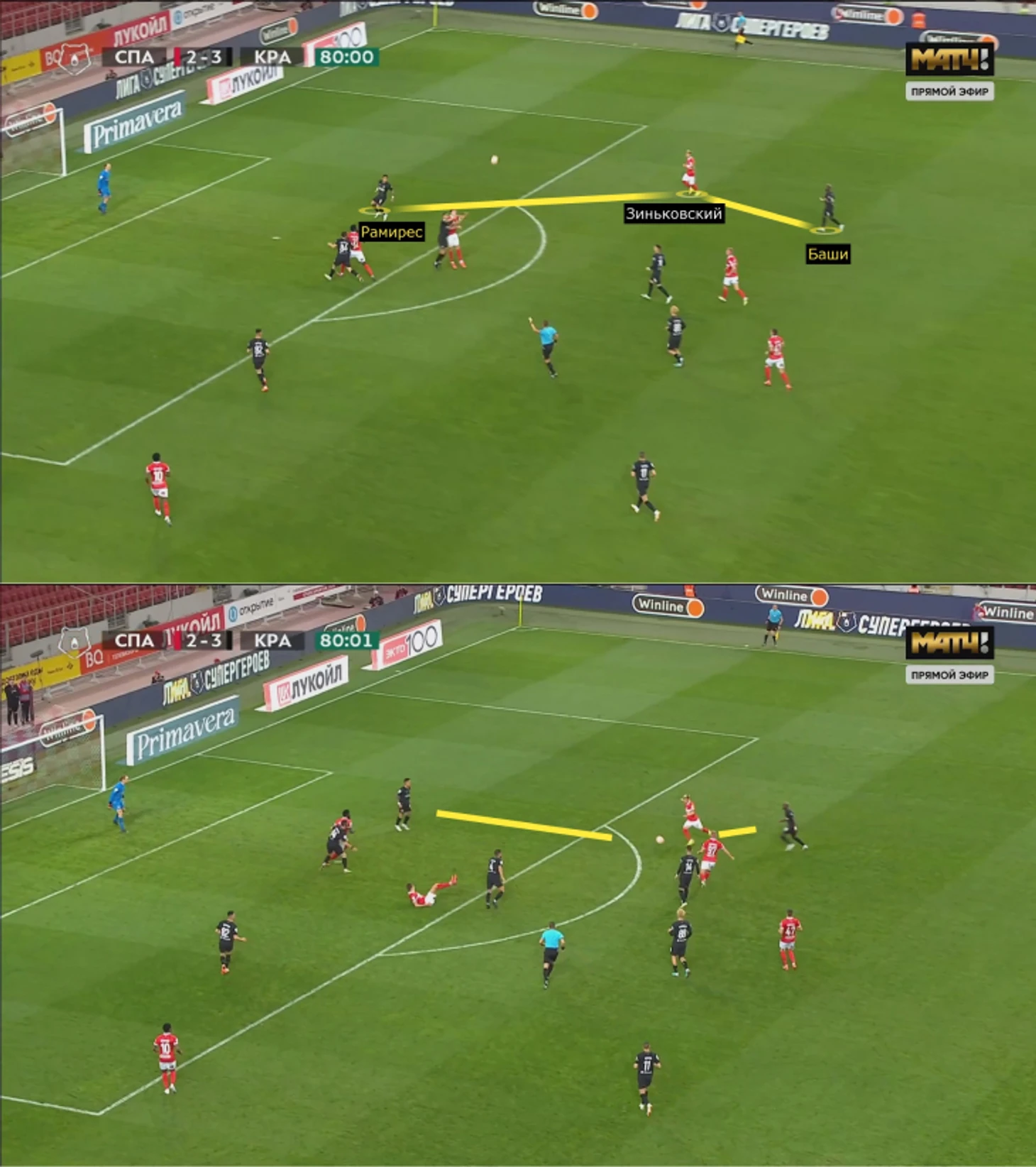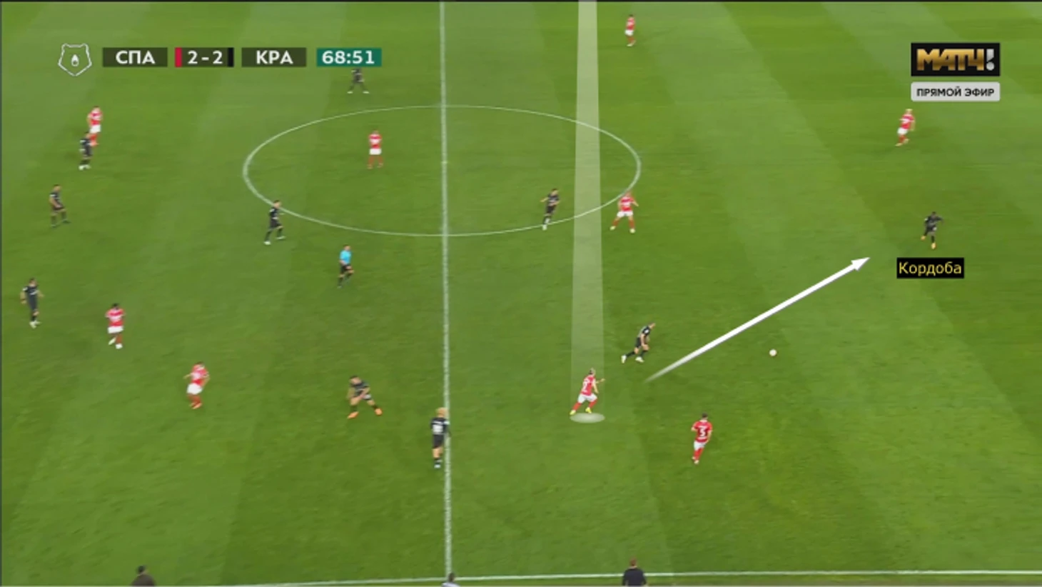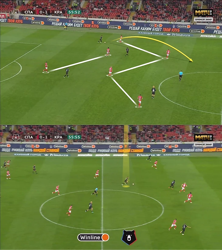 «Краснодар» несколько раз топово выбегал на чужую половину через одинаковые алгоритмы: Рамирес или Алонсо оказывались почти свободны и отрезали прессингующих полузащитников. Характерно, что «Спартак» и дальше терял левый фланг – уже при счете 2:3 Сперцян здорово нашел Ионова на углу вратарской.