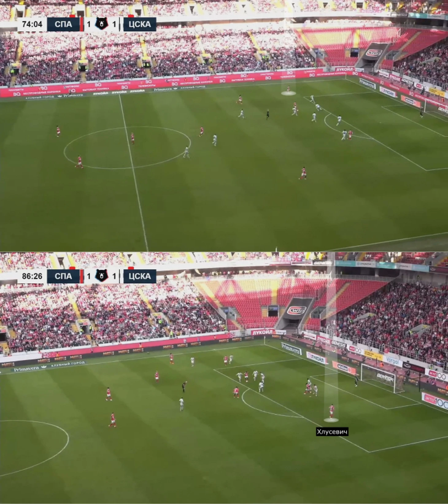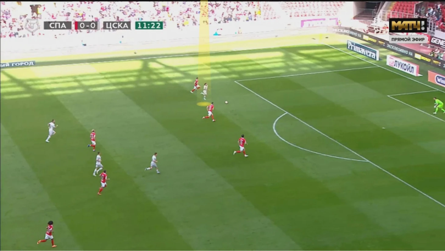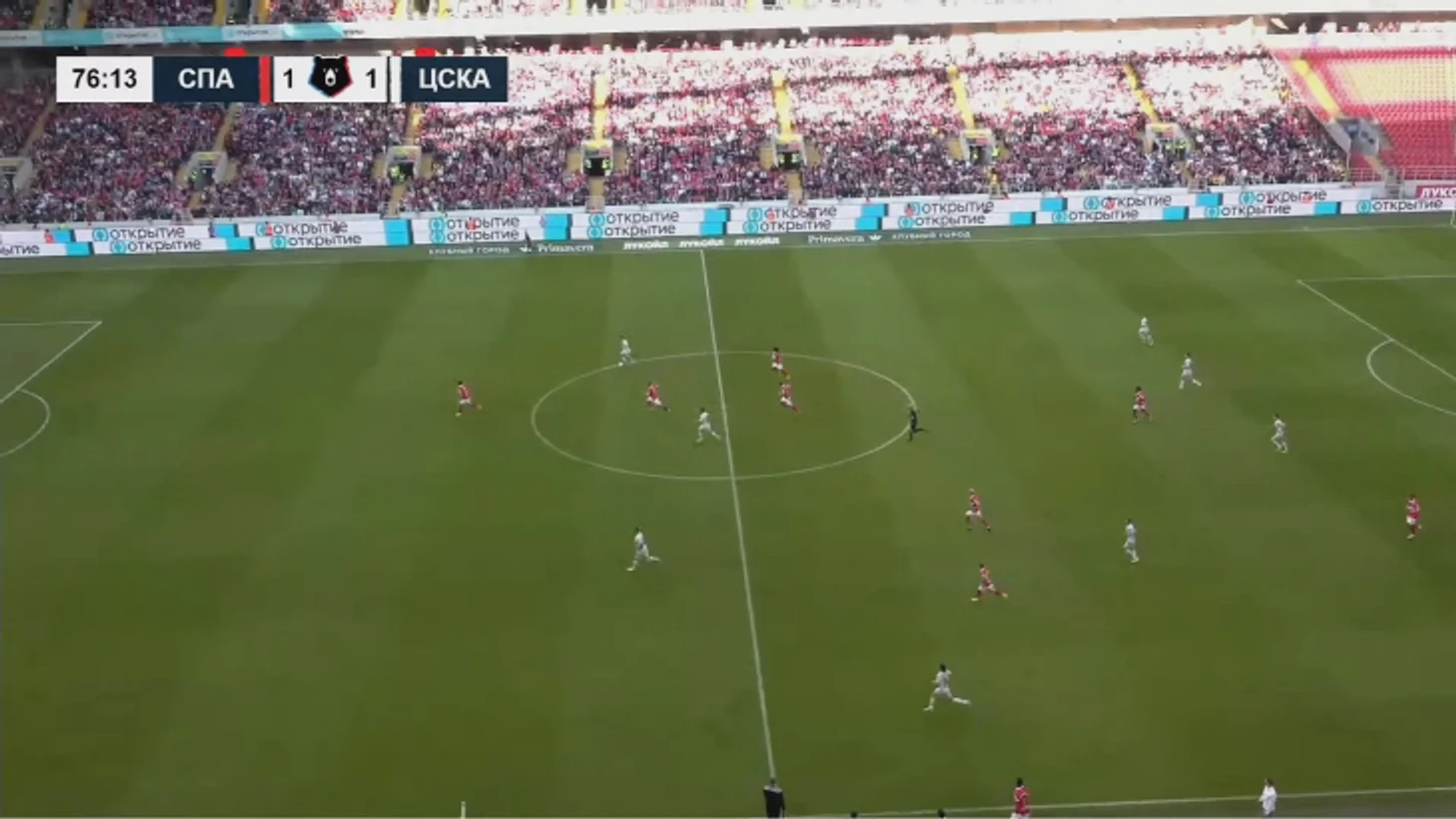 После удаления Соболева и Роши «Спартаку» и ЦСКА пришлось адаптироваться: игра раскрывалась в обе стороны (точнее – зоны), хозяева оборонялись в 5-2-2, а гости заканчивали в 4-2-3. На старте команда Федотова могла опасно выбегать, но не доводила атаки до ударов. Главным героем стал Мойзес, оставшийся в паре с Дивеевым. Сначала он прорвался через полуфланг и отдал Медине.