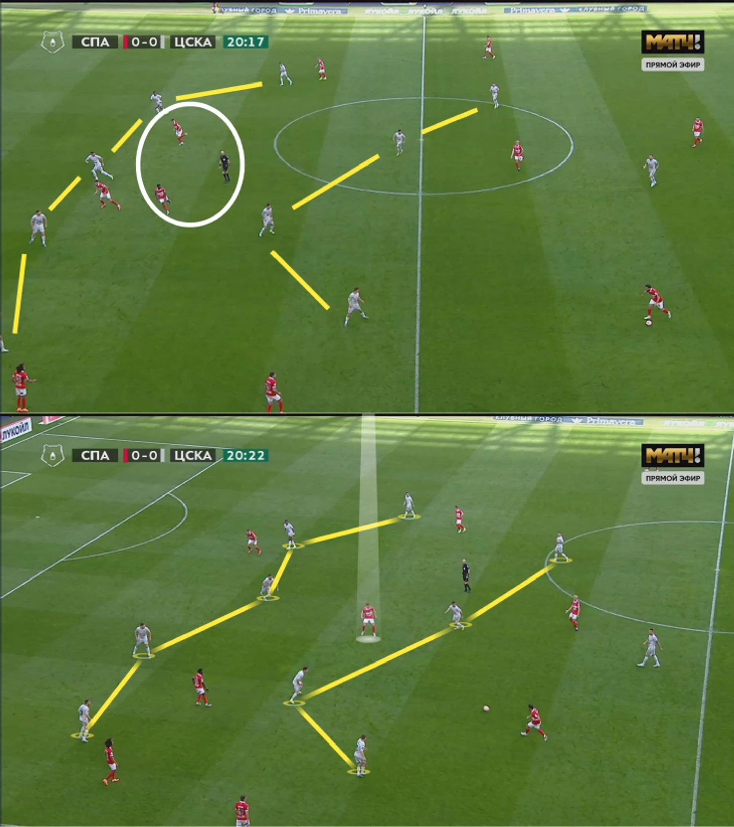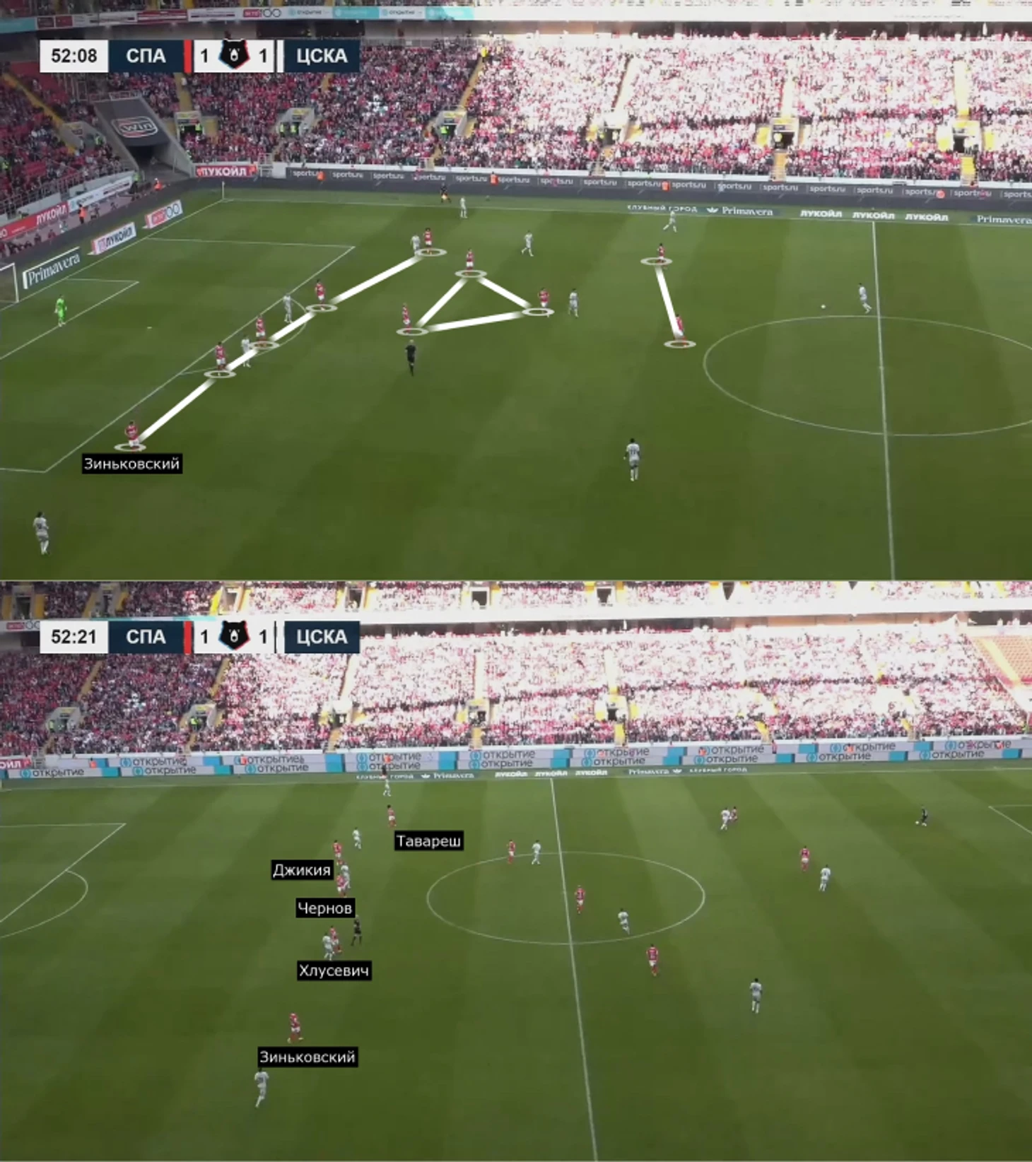 Зато идея помогала «Спартаку» на фланге Тавареша: Томаш поднимался в прессинг, Джикия смещался левее, Чернов и Хлусевич – за ним по цепочке (в некоторых эпизодах и Литвинов). Расположение Никиты и Даниила заметно в эпизоде с ударом Зобнина из-за штрафной: Джикия агрессивно отработал на фланге, а «Спартак» разыграл комбинацию с дальним ударом.