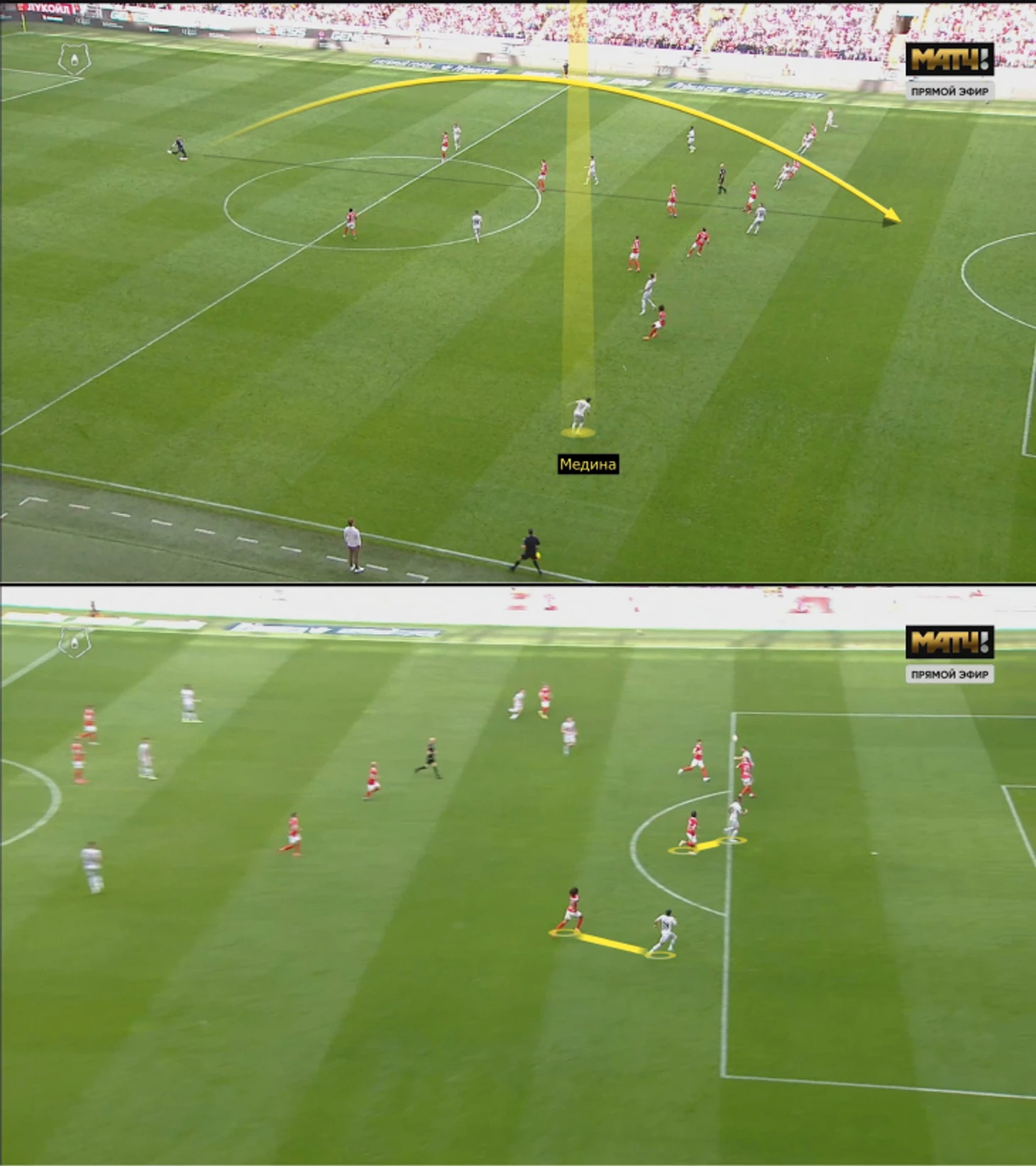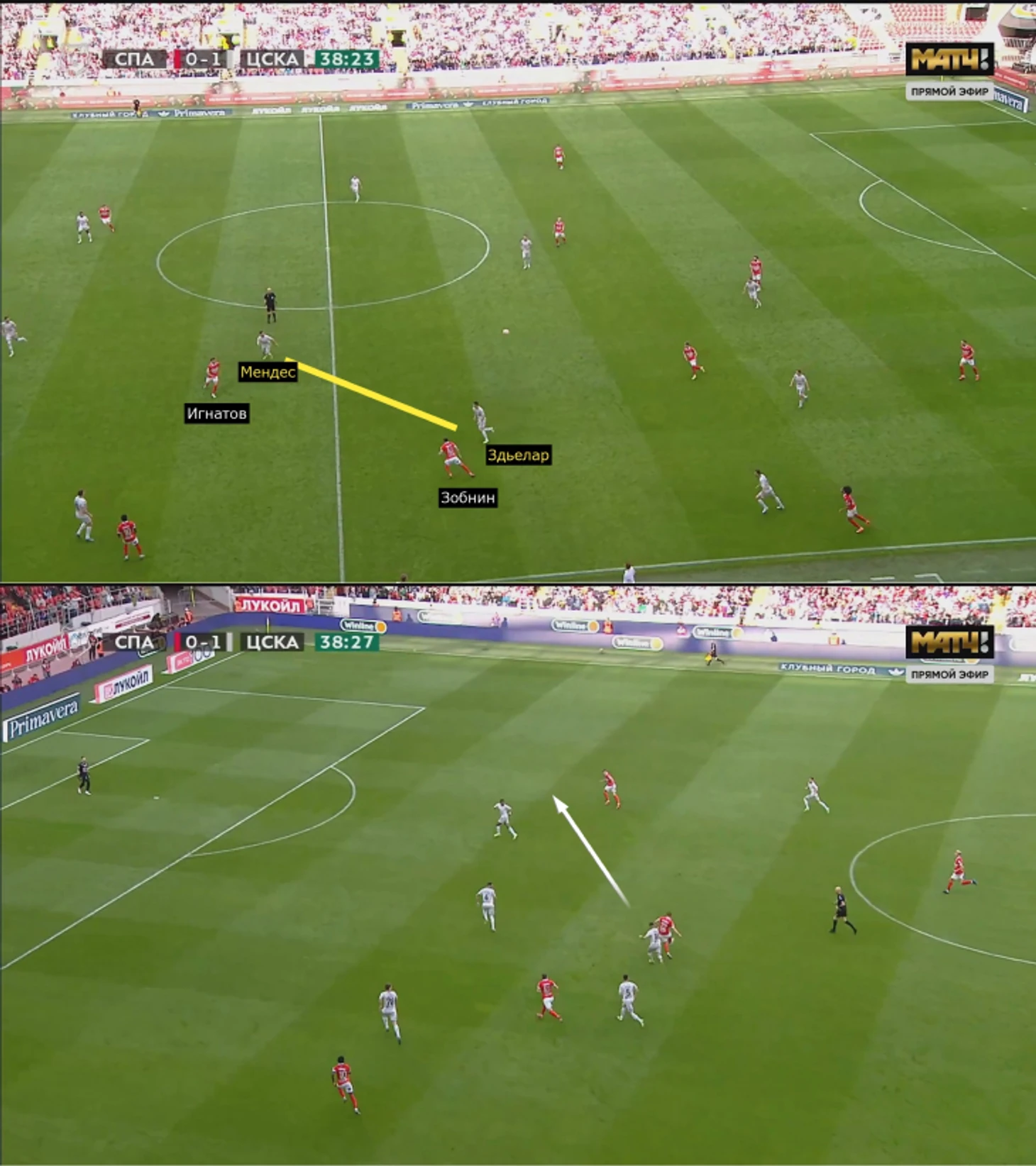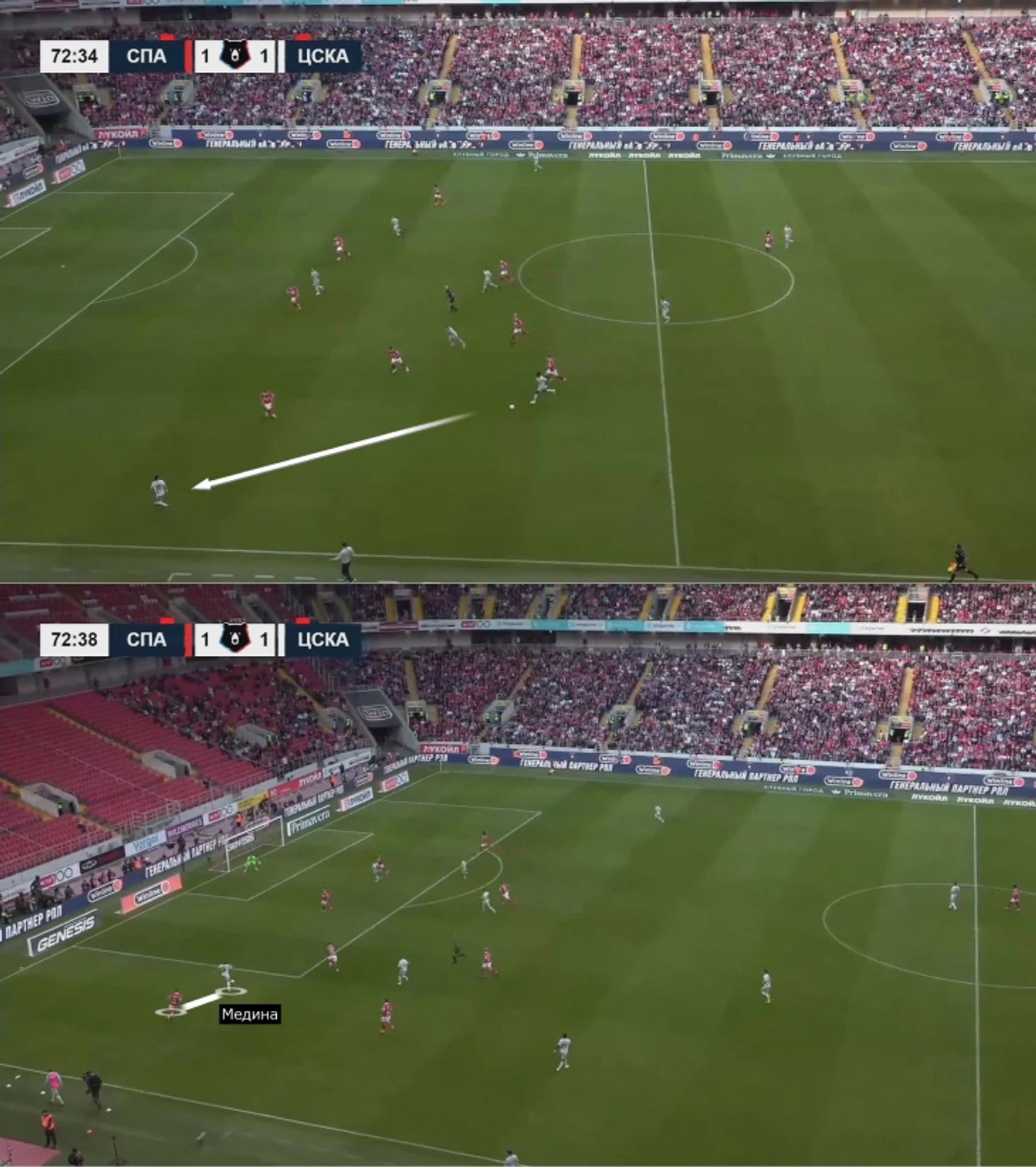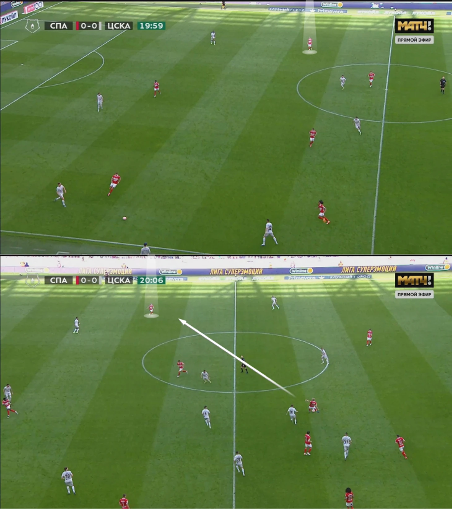 ЦСКА топово выбегал в контратаки после перехватов и подборов. Отличный пример: Зиньковский высоко, Чернов обрезал «Спартак», поэтому Гайич легко нашел Медину, отлично навесившего на Облякова, так как Хесуса почти не встречали.