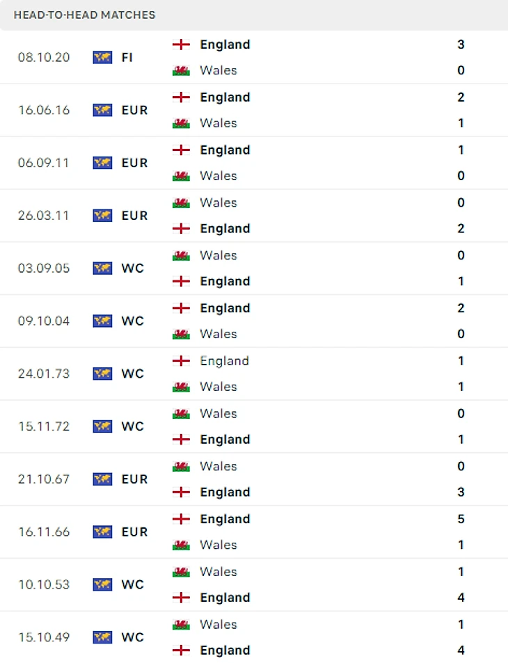 — История очных встреч между этими командами очень богата: первый матч был сыгран в 1879-м году. Победу праздновала Англия - 2:1. Всего же они играли между собой 103 раза: 68 побед Англии, 21 ничья и 12 побед Уэльса.