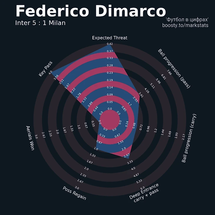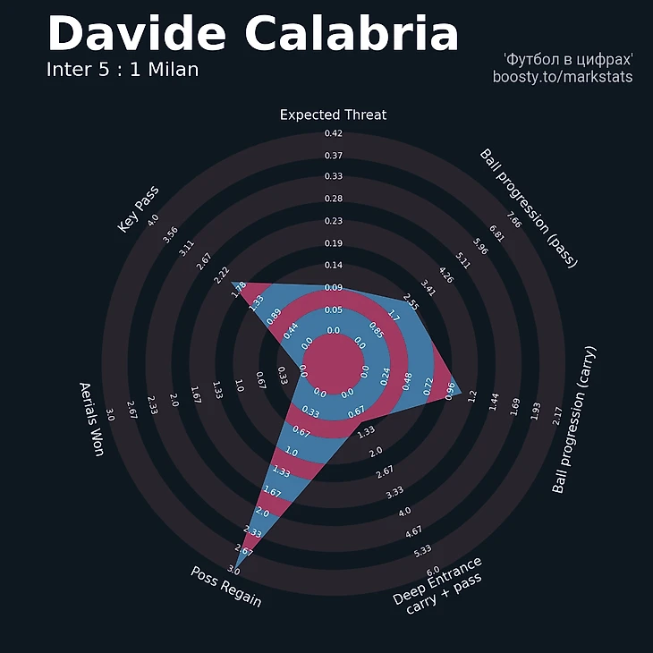 Индзаги же напротив, – не мудрствуя лукаво, сделал ставку на самую могучую роль в формации 3-5-2 – латералей, и не прогадал. Димарко, например, преуспел во всех вариациях: созидании, разрушении и позиционной игре, а по итогам противостояния и вовсе стал лучшим по xThreat. Упомянутый Калабрия рядом с ним смотрелся неказисто и потерянно.