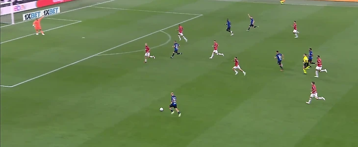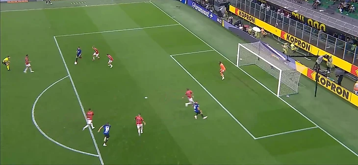 Финализируем эпизодом с голом Фраттези. Тут на удивление всё неплохо с персональными ориентировками, так как Лаутаро и Арнаутович даже в динамике перекрыты наглухо. Однако Тео, изначально упорно сопровождавший Фраттези, отклеился ровно в момент передачи армянина на итальянца. Далее – уже классическая брешь, которую никто не успеет закрыть.