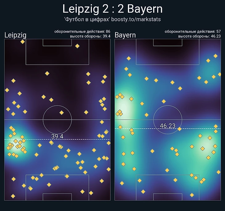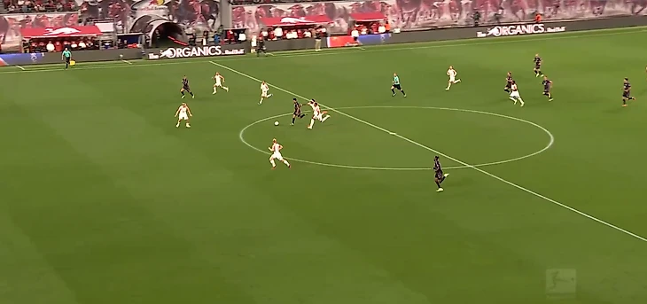 Краеугольным же камнем смены лидерства стал увядающий прессинг «Лейпцига». Для наглядности приведу несколько скринов. Так, например, хозяева начинали матч (на фото 2-я минута):