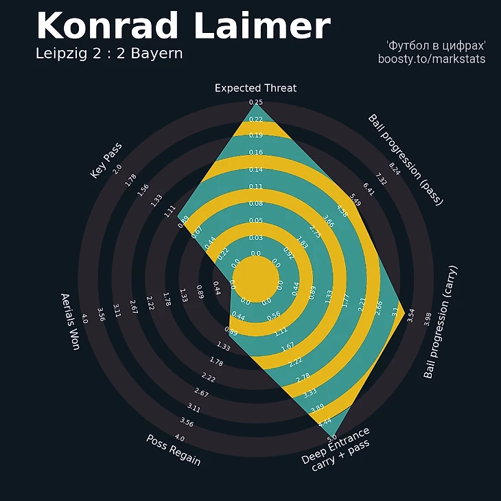 Финализировать хотелось бы разбором игры Кейна. Харри, очевидно являющийся сейчас самой «низкой» девяткой Старого Света, вчера как будто даже переборщил с этой своей особенностью. Да, отработки англичанина, делавшие разницу и с «Байером», и с МЮ, и даже с «Вердером», казались исключительно уместными, но против «Лейпцига» игроку его амплуа требовалась большая острота. Исключая эпизод с пенальти, единственным актом созидания был навес на Мотинга, который, собственно, и вышел лишь для восполнения недостающей остроты в штрафной. У Харри итоговые 0.15 по xThreat лишь благодаря этому эпизоду (xG, повторюсь, нет смысла считать).